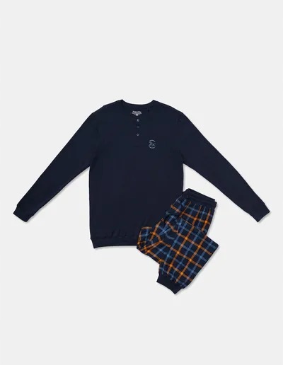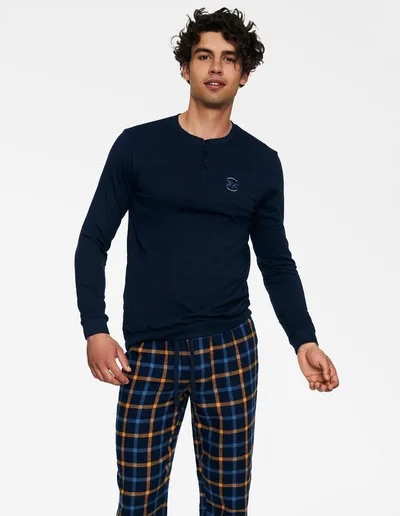 - HendersonTRADE - чоловіча піжама ПРЕМІУМ класу з високоякісної 100% бавовни, що гарантує якість і свободаb>користування, а такожкомфортпід час сну. Використана бавовна - м'яка і еластична тканина, яка забезпечує комфорт навіть при тривалому використанні, не сковує рухів і не тисне на тіло. Комплект складається з темно-синьої футболки та довгих брюк у клітинку зі шнурком на талії.