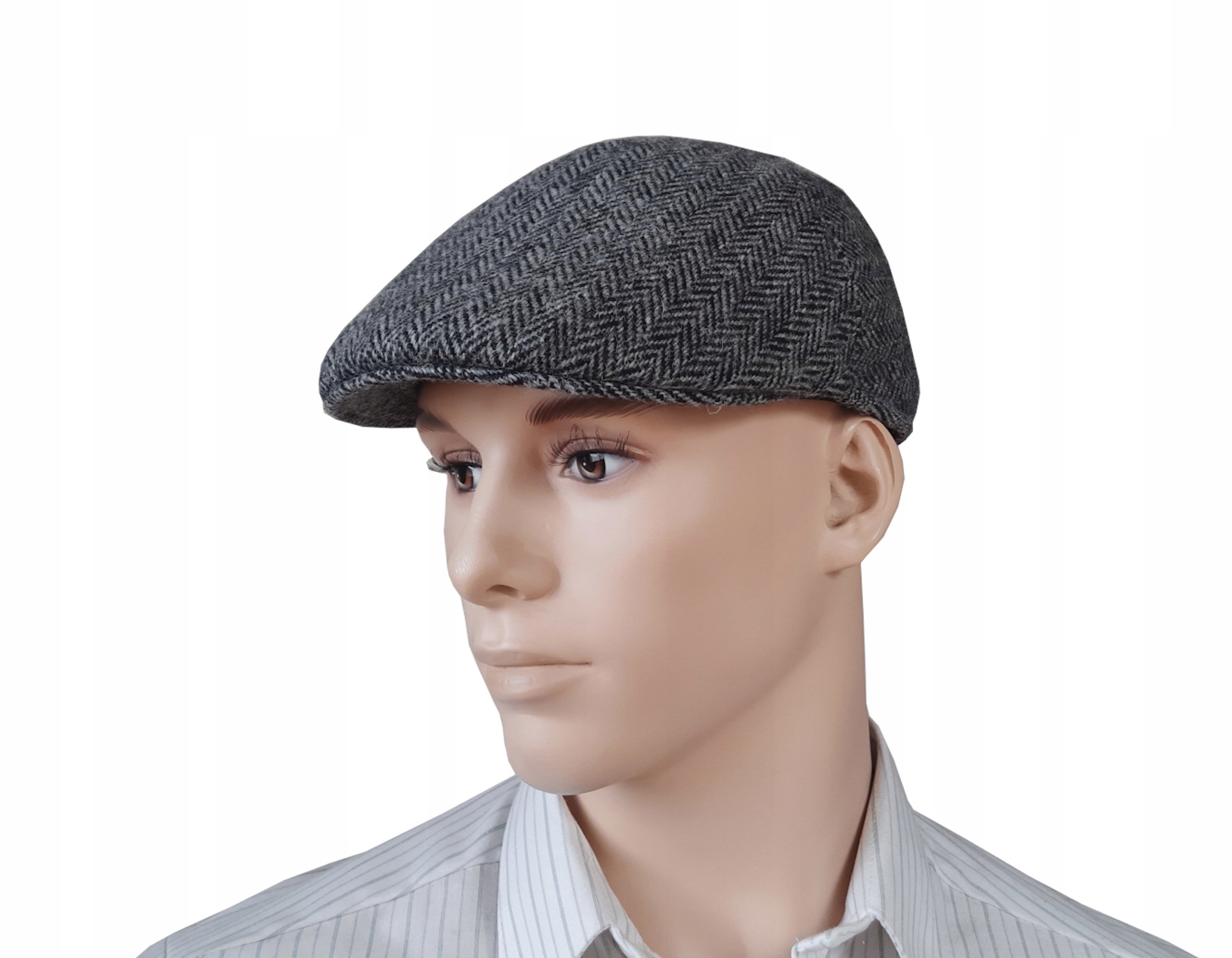 Тепла чоловіча кепка в ялинку з переплетенням світло-сірого та чорного кольорів. Ідеально підходить для осінньої та зимової погоди. Оснащений складними амбушюрами, які ідеально захищають голову та вуха від холоду. З 100% вовни. Всередині підкладка з поліефірного флісу та бавовняний ремішок.