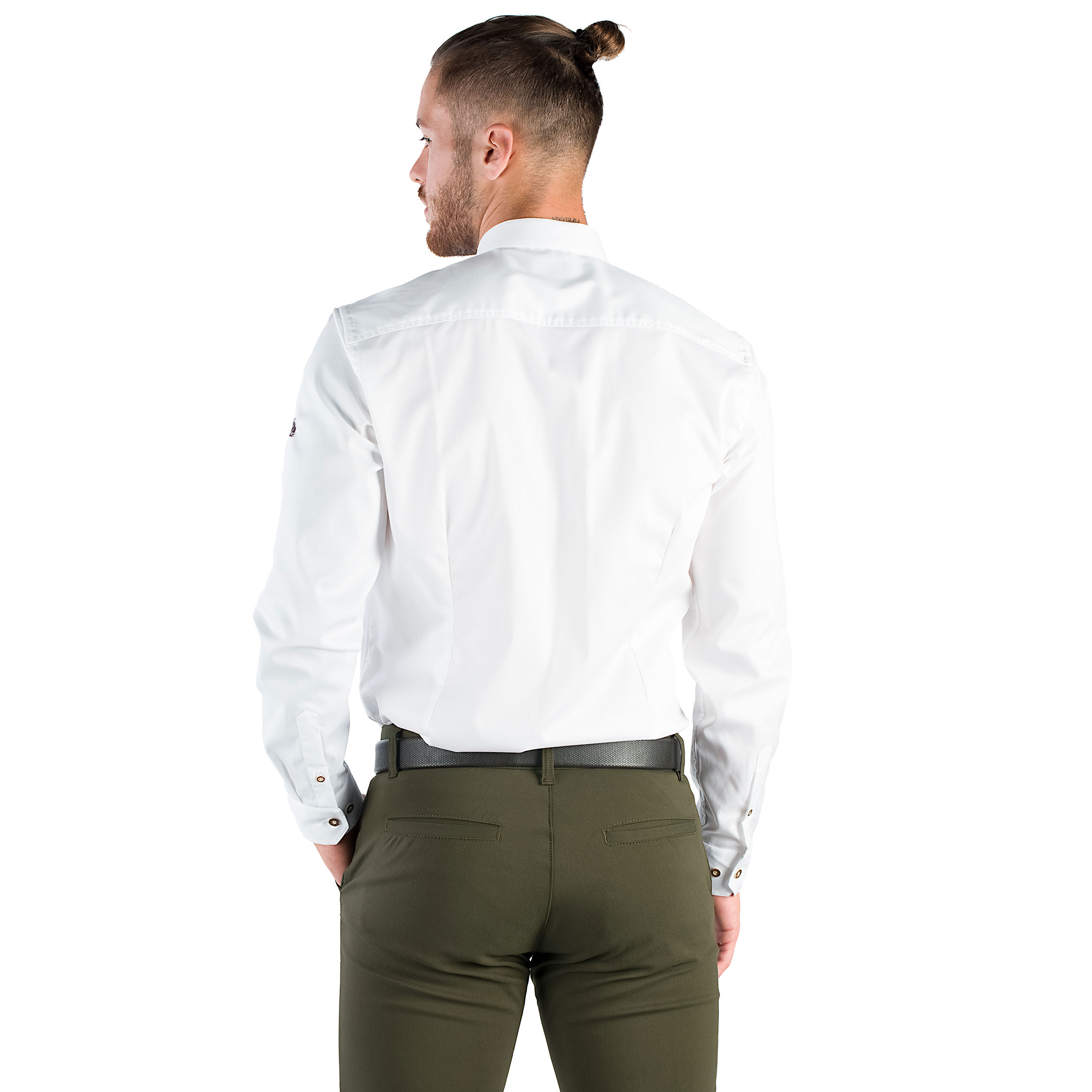 Сорочка оснащена коричневими ґудзиками з імітацією рогів, що контрастує з білим. Вічний зовнішній вигляд сорочки робить її ідеальною для костюма, а також для джинсів і піджака.