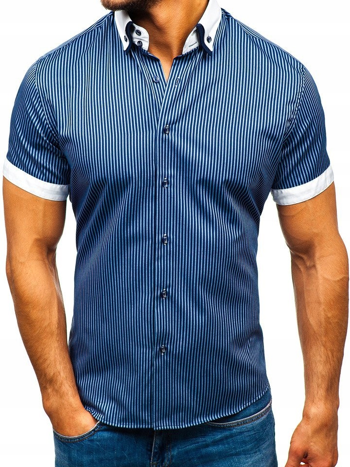 Чоловіча сорочка з коротким рукавом у смужку, темно-синя Bolf 1808, розмір M