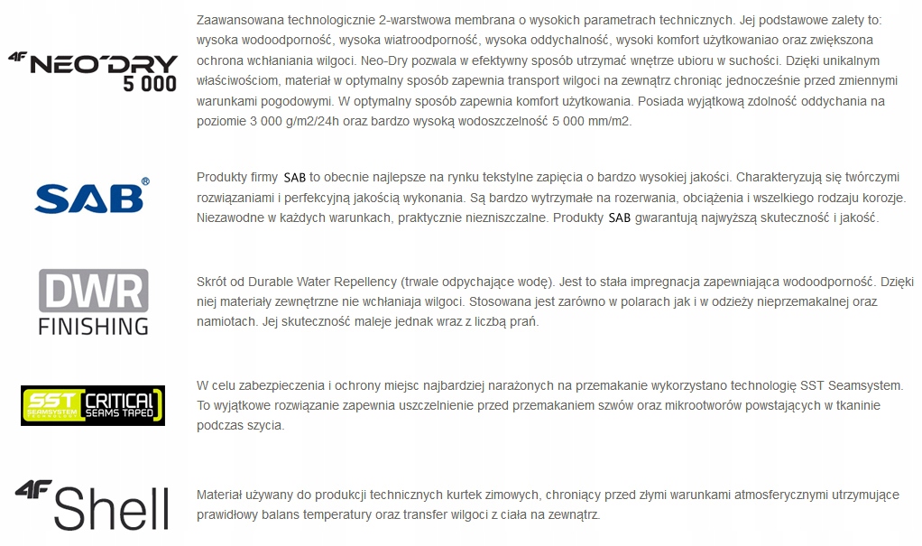 Технічно вдосконалена зимова куртка від 4F з нової колекції, виготовлена за технологією 4FShell. Характеризується високою якістю виготовлення та сучасним привабливим дизайном, що відповідає останнім тенденціям. Виготовлений з технічного матеріалу 4FShell з мембраною Neo'dry, яка забезпечує захист під час зимових заходів. Цей матеріал надзвичайно м'який і приємний на дотик, не слизький і не блищить, як у більш дешевих моделях курток інших виробників. Проклеєні шви і гідрофобне просочення в технології DWR обмежують поглинання води ззовні. Внутрішня поліефірна ізоляція зберігає тепло всередині. Ідеально підходить для повсякденного використання та інтенсивного активного відпочинку як гірськолижна куртка. Куртка має різні типи кишень, в тому числі: для окулярів, мобільного телефону або пропуску і багато інших інноваційних рішень. У куртці використовується мембрана Neo'dry 5.000, високоякісна ПУ мембрана, яка захищає користувача від вологи з навколишнього середовища. Завдяки мільйонам мікроотворів у матеріалі Neo'dry має потрійну властивість: він блокує вітер і воду з навколишнього середовища, а також виводить піт і вологу, що виникають у результаті підвищеної фізичної активності. Куртка також має високий комір-стійку, підборіддя перед застібається блискавкою, застібки SAB, липучки на манжетах і регулювання низу куртки за допомогою куліски і стопорів. Завдяки своїй гнучкості він ідеально прилягає до фігури. Невелика вага додаткових шарів і ефективна система вентиляції гарантують тепловий комфорт. Ідеально підходить для всіх видів спорту на відкритому повітрі та щоденного використання.