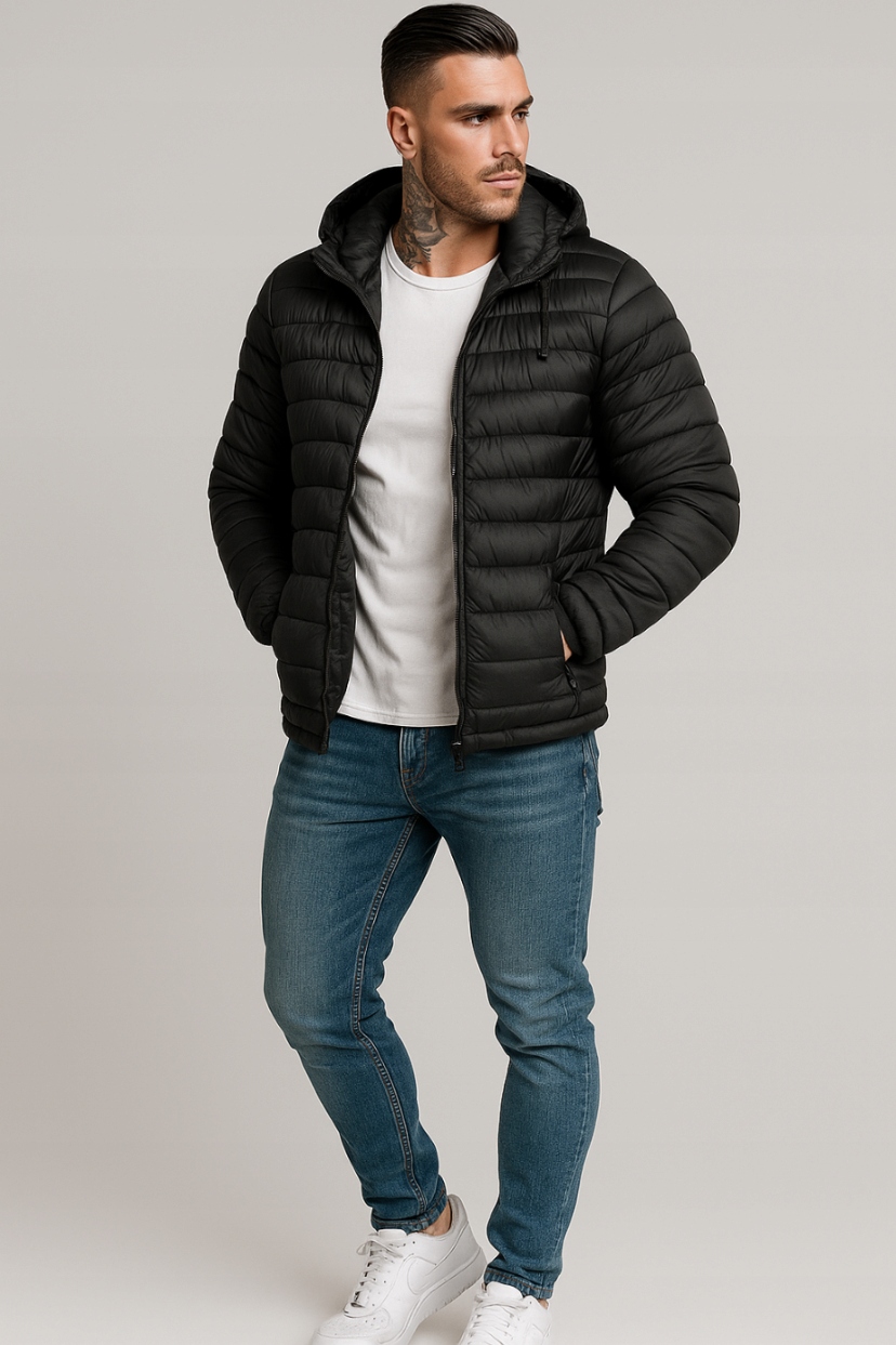 Класична чорна чоловіча куртка з капюшоном - ідеальне поєднання універсального стилю та комфорту. Легкий і теплий, він добре працюватиме в холодні дні, не обмежуючи свободу рухів. Стьобаний крій підкреслює сучасний вигляд, а практичні бічні кишені на блискавці підвищують функціональність. Ідеально підходить для повсякденного використання - з джинсами, спортивними штанами або повсякденним одягом. Чорний колір гарантує позачасовий вигляд, який завжди залишається модним.