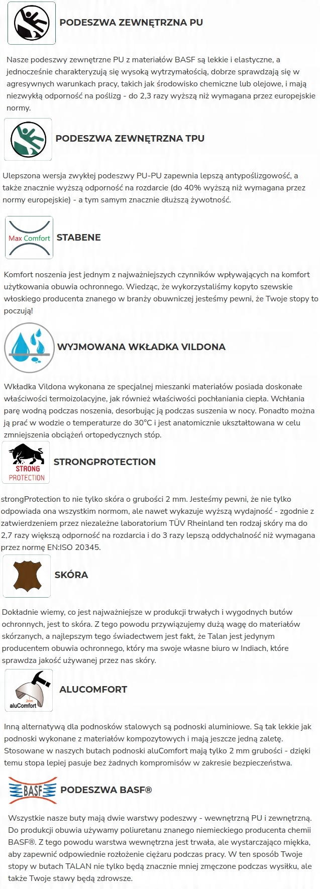 Верх у цьому стилі виконаний з натуральної шкіри - Сильний захист. Навантаження на розрив шкіри перевищує 2,1-2,7рази норму, що міститься в європейському стандарті EN ISO 20345: 2011. Металевий підносок і антиперфораційна устілка робочого взуття Talan забезпечують надійний захист протягом робочого дня. .