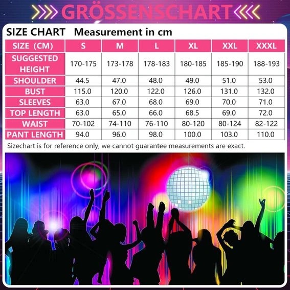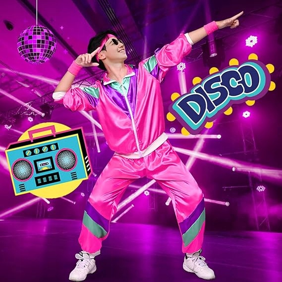 - Чоловічий одяг 80-х Підходить для повсякденного одягу, пробіжок, тренажерного залу, хіп-хоп вечірок, ретро-вечірок, диско-вечеринок у костюмах, вечірок у стилі 80-х і 90-х, вуличного одягу, святкувань, Хелловіна, Різдва тощо. Цей чоловічий і жіночий диско-костюм 80-х — привабливий і модний вибір, який виділить вас.