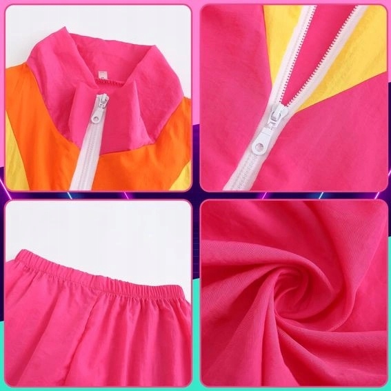 - Унікально оновлений жіночий костюм 1980-х із яскравим кольоровим дизайном, куртка в стилі ретро з практичною блискавкою і кишеню. Довгі рукави з еластичними манжетами, брюки з високою талією і регульованим шнурком. Комфортний і стильний дизайн унісекс ідеальний для будь-якого випадку.