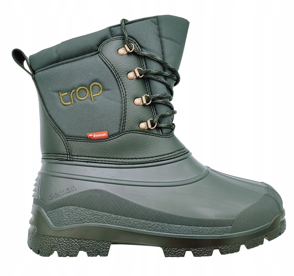 Черевики TROP 2/ DEMAR/ CAT.I. Високе утеплене взуття. Виготовленийз водонепроникної поліефірної тканини та шкіряного матеріалу. Всередині змінна багатошарова утеплююча вставка (повсть/трикотаж) ефективно утримує тепло всередині взуття. Вкладиш можна прати при 40 С. Ковзання ідеально облягає взуття на литку і захищає від потрапляння снігу всередину. Підошва з термогуми еластична і не змінює своїх властивостей при низьких температурах. Різьблений протектор не ковзає, забезпечуючи стабільність і безпеку в несприятливих умовах, таких як нерівні, слизькі поверхні в гірській і лісовій місцевості. Дуже тепле і міцне взуття, водонепроникне, ідеальне для пересування по складній місцевості, незалежно від погоди. Відповідає вимогам мисливців, лісників, рибалок і вимогливих любителів зимових експедицій.