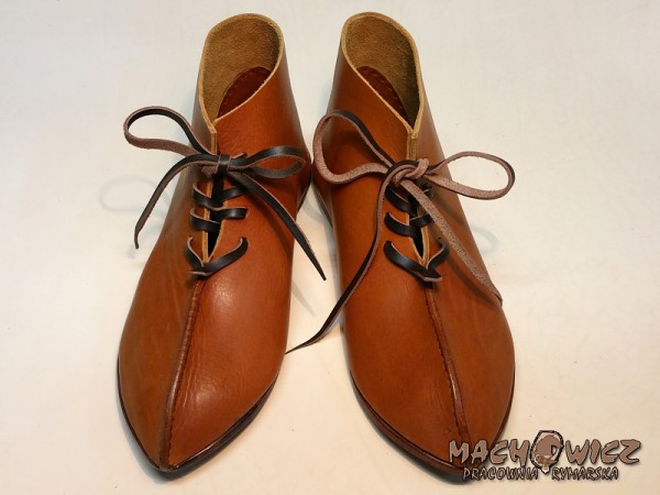 Чоловіче взуття за мотивами середньовічної іконографії. Виготовлені з натуральної шкіри, підкладка з рослинного жиру, товщиною приблизно 2,5 мм. Підошва з товстої задньої шкіри, приблизно 5 мм. Взуття зшито вручну вощеним шпагатом і глухим швом, щоб уникнути стирання шва. Взуття укріплене каблуком з товстої обушної шкіри, що кріпиться до підошви дерев'яними шпильками, за традиційною технологією виготовлення взуття. Підошва та каблук взуття просочені бджолиним воском. Взуття зі шнурівкою зі шкіряним ремінцем.