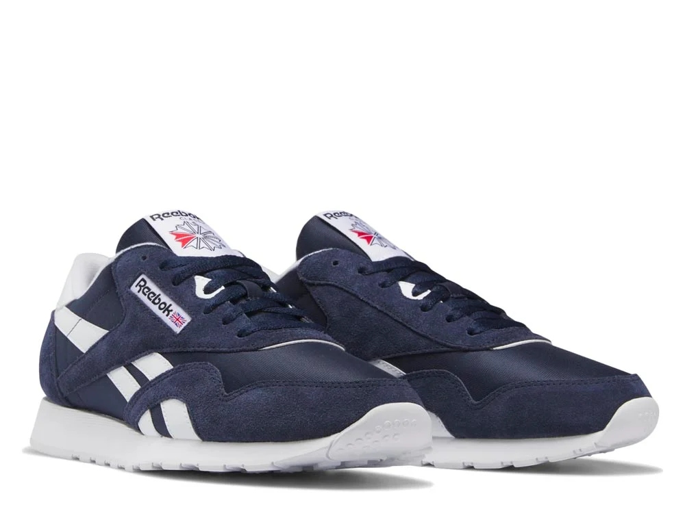 Рейбок Класичний нейлон - класичні чоловічі темно -сині кросівки, які представляють ретро -стиль. Взуття має нейлонову частину верхню частину та середню підошву Єви. Вірні своїм корінням 1991 року у них є гладкий нейлоновий верх з м'якими, масляними замшевими накладками, завдяки якому вони забезпечують певний дизайн, який ви можете поєднувати з усім у вашому гардеробі.