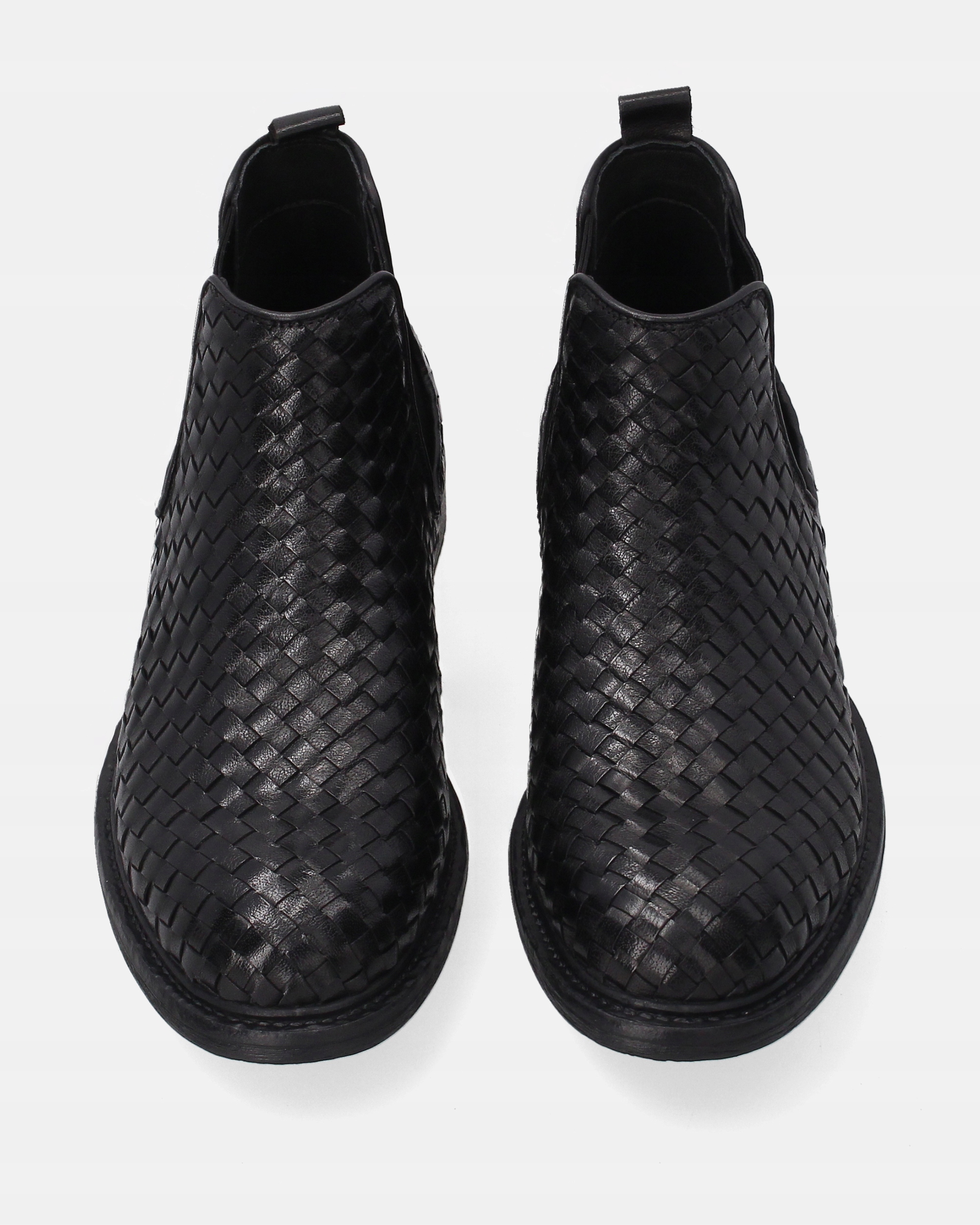 Чоловічі черевики челсі з високоякісної натуральної шкіри чорного кольору. Верх із тканим візерунком надає всьому виробу виразного характеру. Еластичні вставки з боків полегшують надягання. Класичний дизайн на плоскій підошві підійде в повсякденному та елегантному стилях.