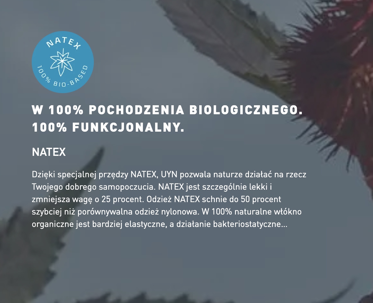 natex знаходиться в 100% біологічному нейлоновому волокні. Одяг Natex висихає до 50% швидше , ніж порівнянні нейлонові предмети.