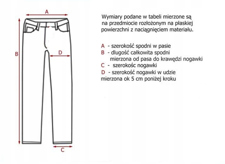30: A- ширина талії 40 см B- довжина штанини 108 см C- ширина штанини внизу 18 см D- ширина стегна 28 см