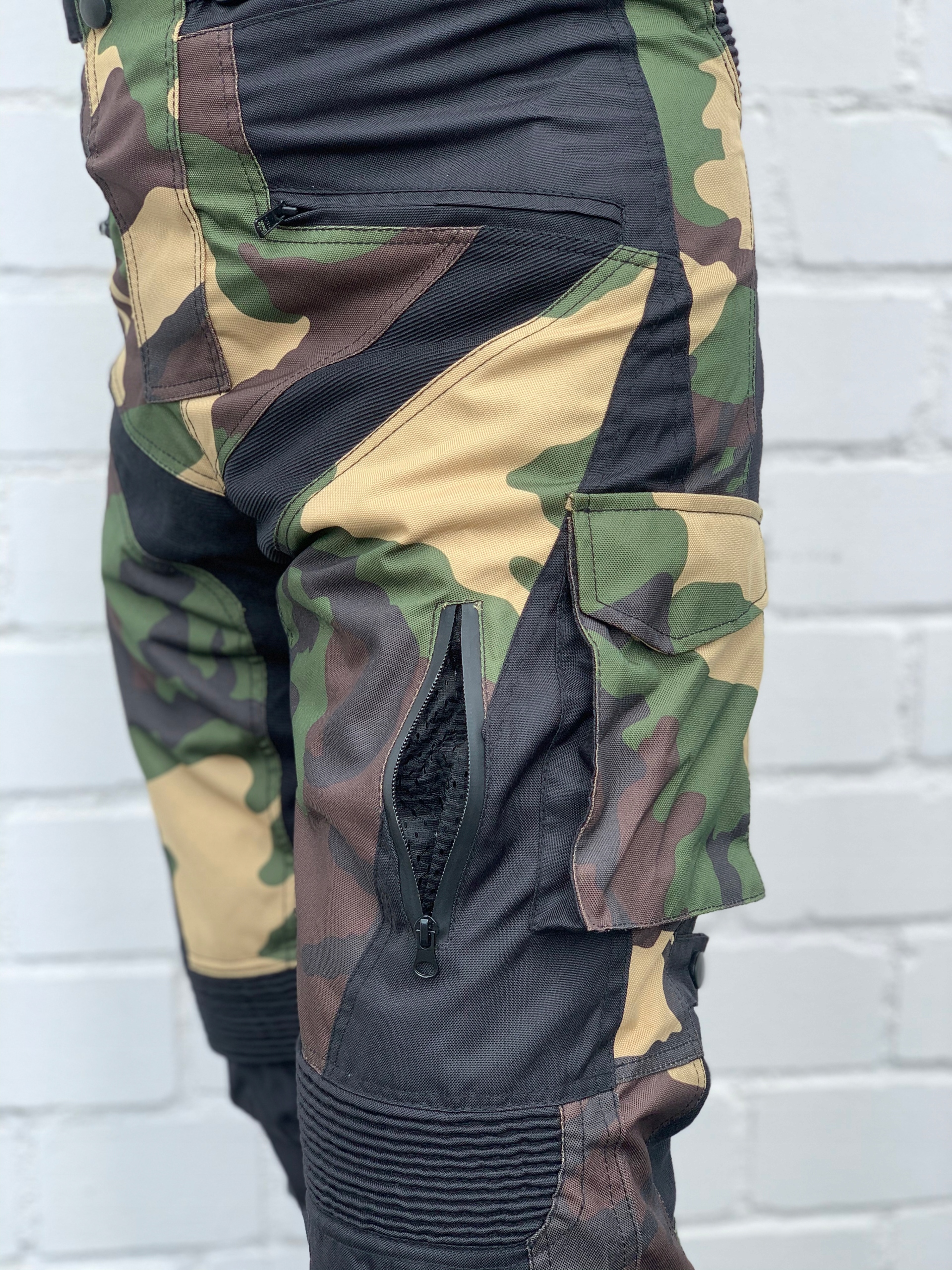 Штани текстильні, підкладка знімна, комплект протекторів, блискавка, кишені, вентиляція, регулювання, камуфляжні вставки