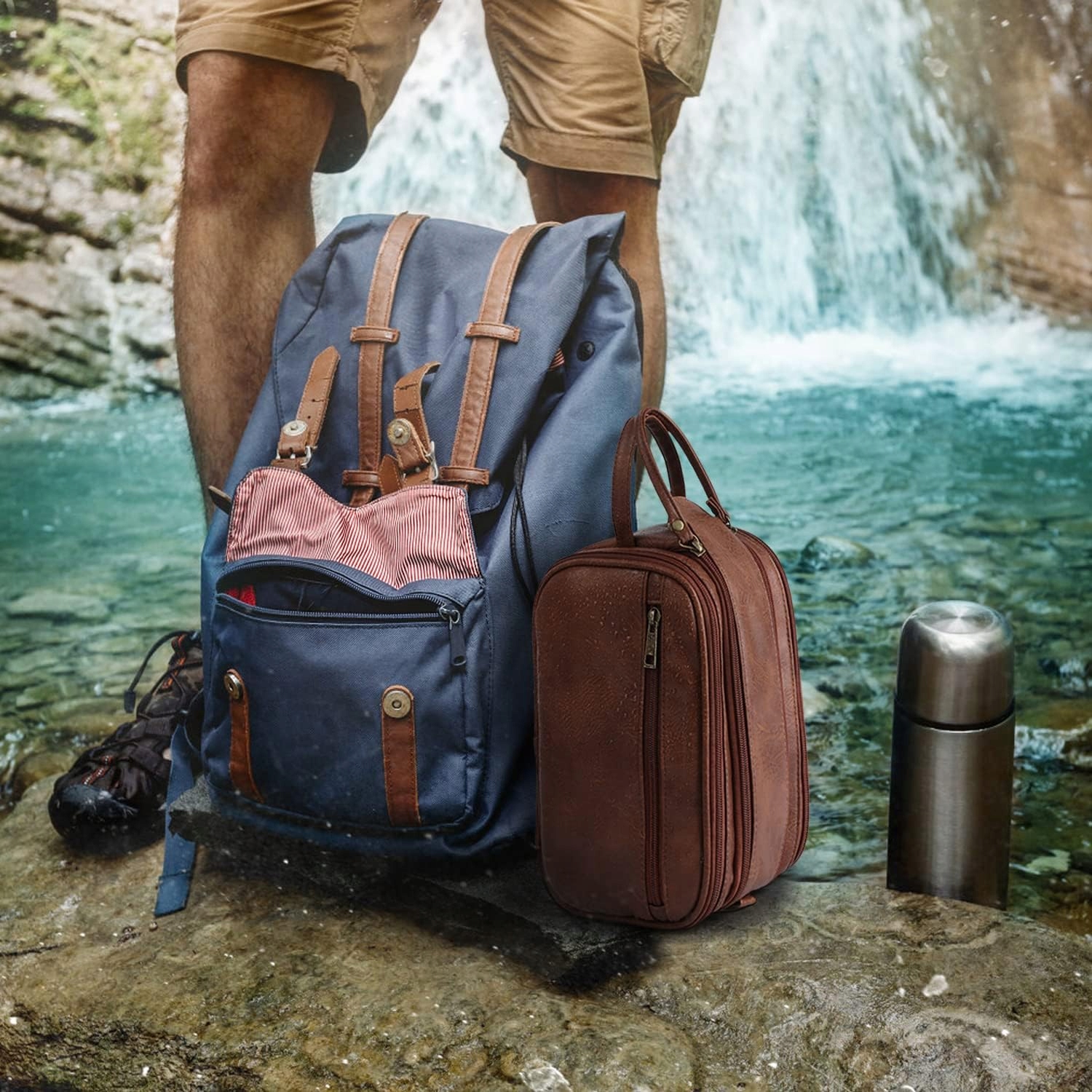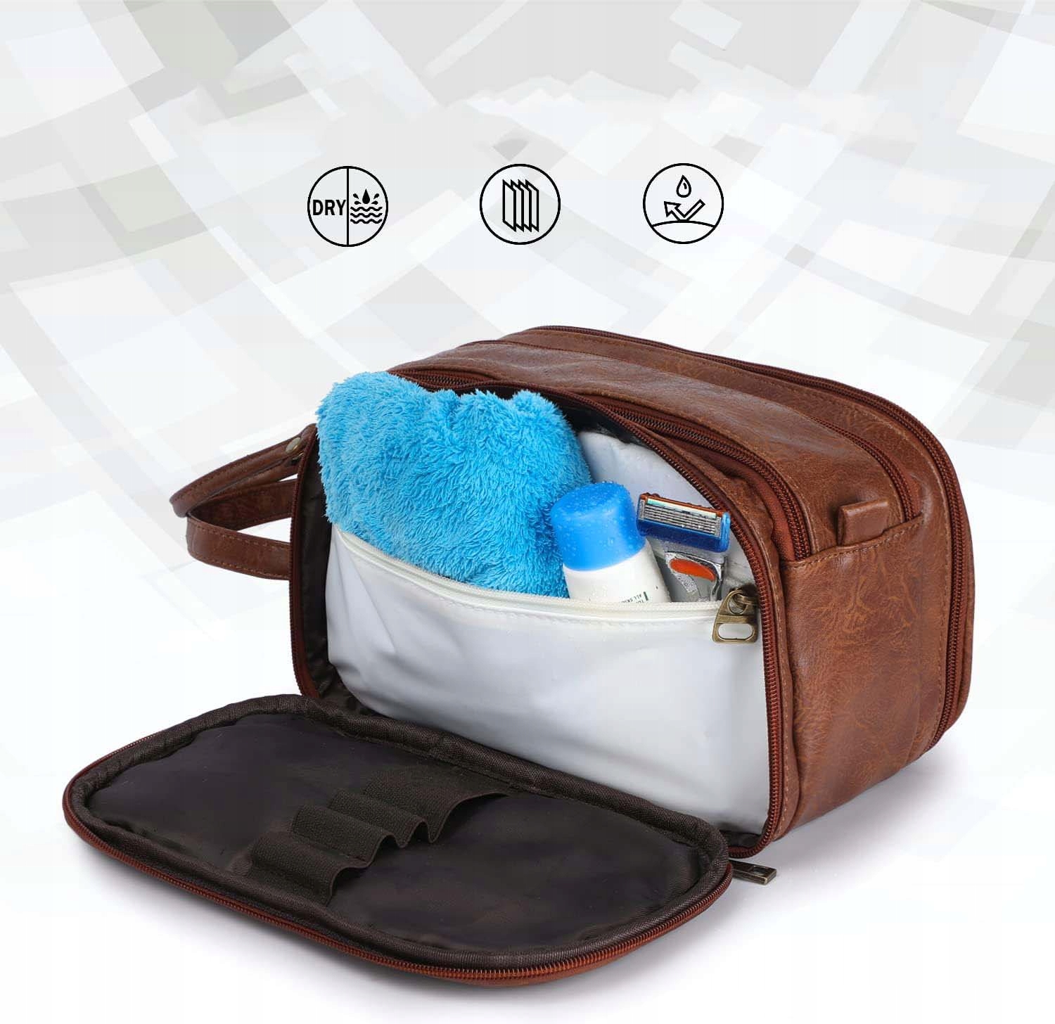 - Водонепроникна внутрішня підкладка, не турбуйтеся про перенесення рідини чи гоління, просто витріть начисто, виперіть, і ваша чоловіча туалетна сумка знову буде працювати.