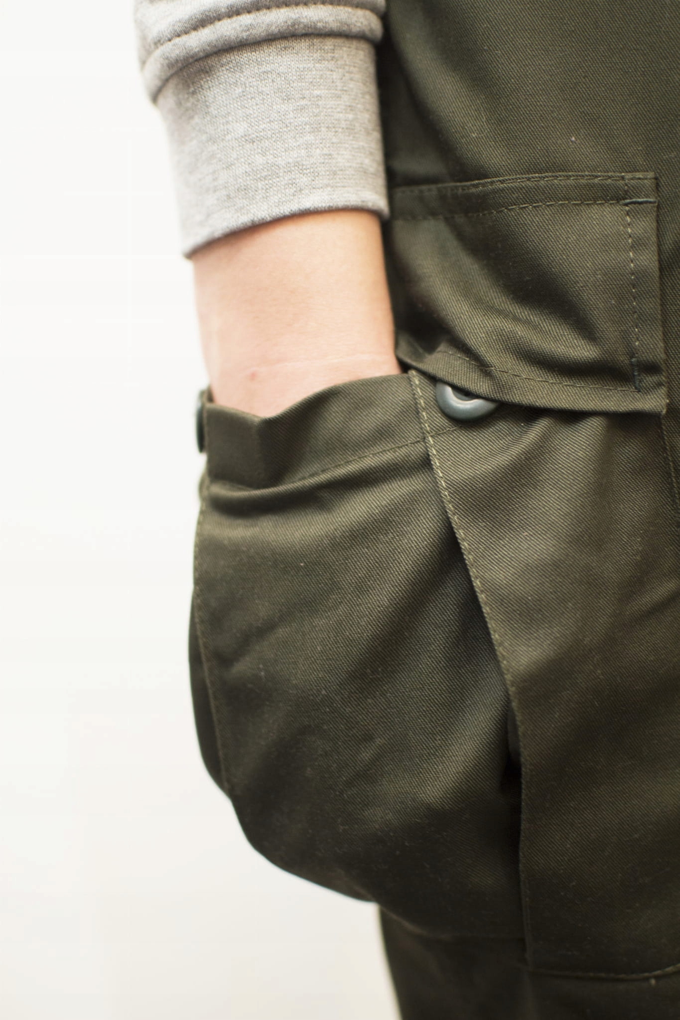 Под штанини застібаються наґудзики. Штани мають дві класичні кишені спереду дві ззаду і дві просторі бічні кишені закриваються на гудзик. Штани приталені по тілу - трохи приталені.