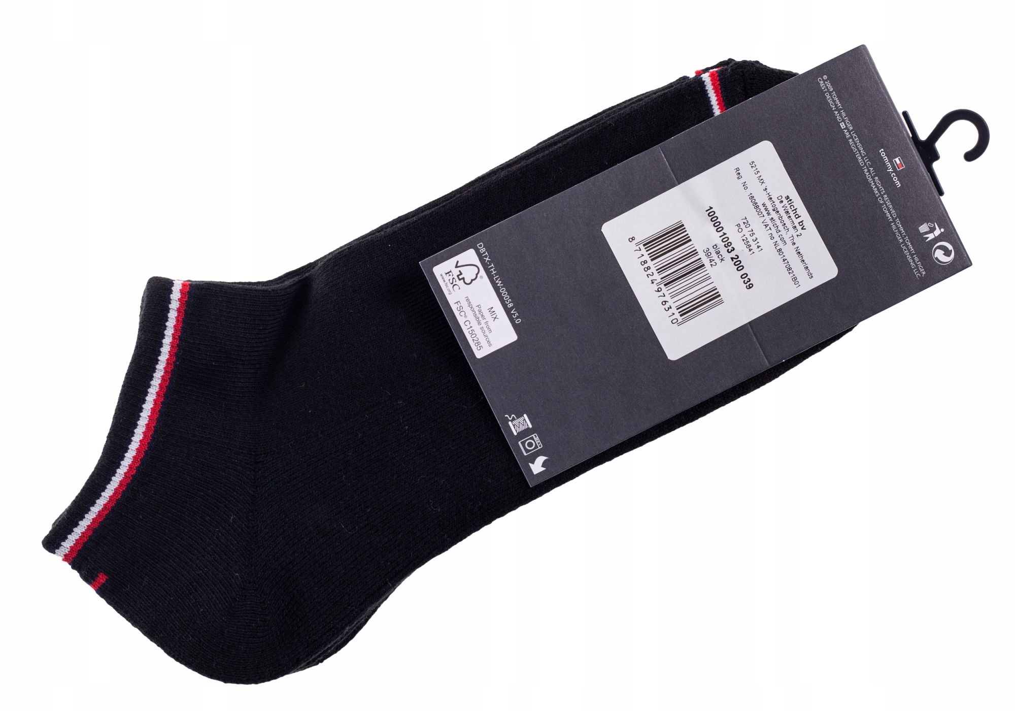 - Логотип: невеликий логотип компанії на спині, прапор у кольорах компанії на пальцях і щиколотках, напис "Tommy Hilfiger" внизу