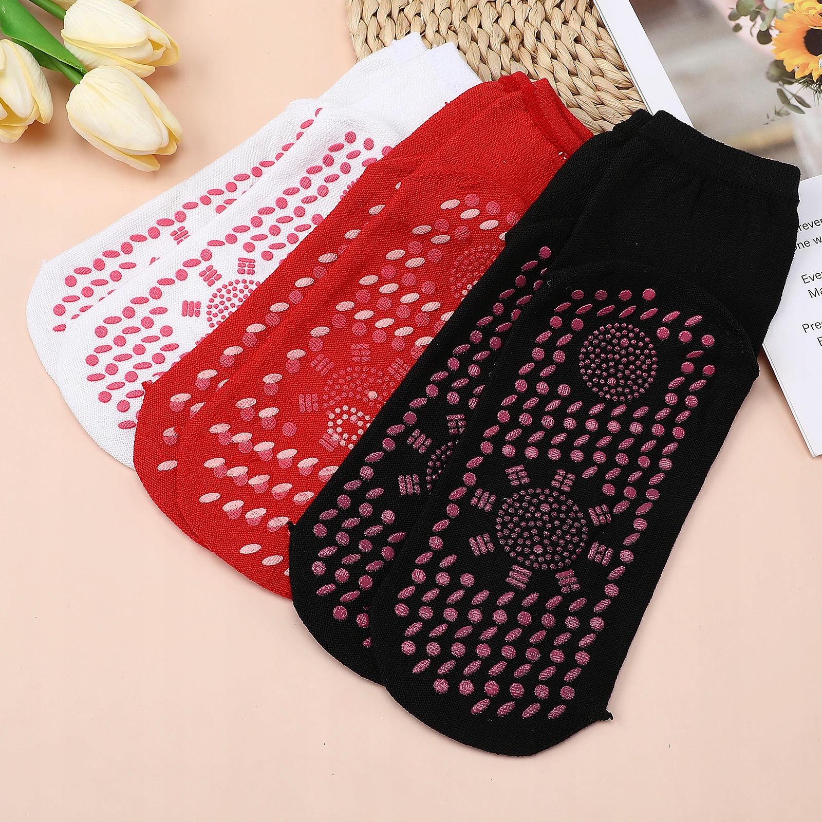 Цей товар являє собою комплект термошкарпеток. Інноваційний силіконовий точковий дизайн стимулює точки акупунктури на стопах для ефекту масажу. Він відповідає вигину вашої стопи, дозволяючи гарячим точкам прилипати до шкіри підошви для комфортної посадки. Тримайте свої ноги в теплі будь-коли та будь-де й більше не бійтеся холодної зими.
