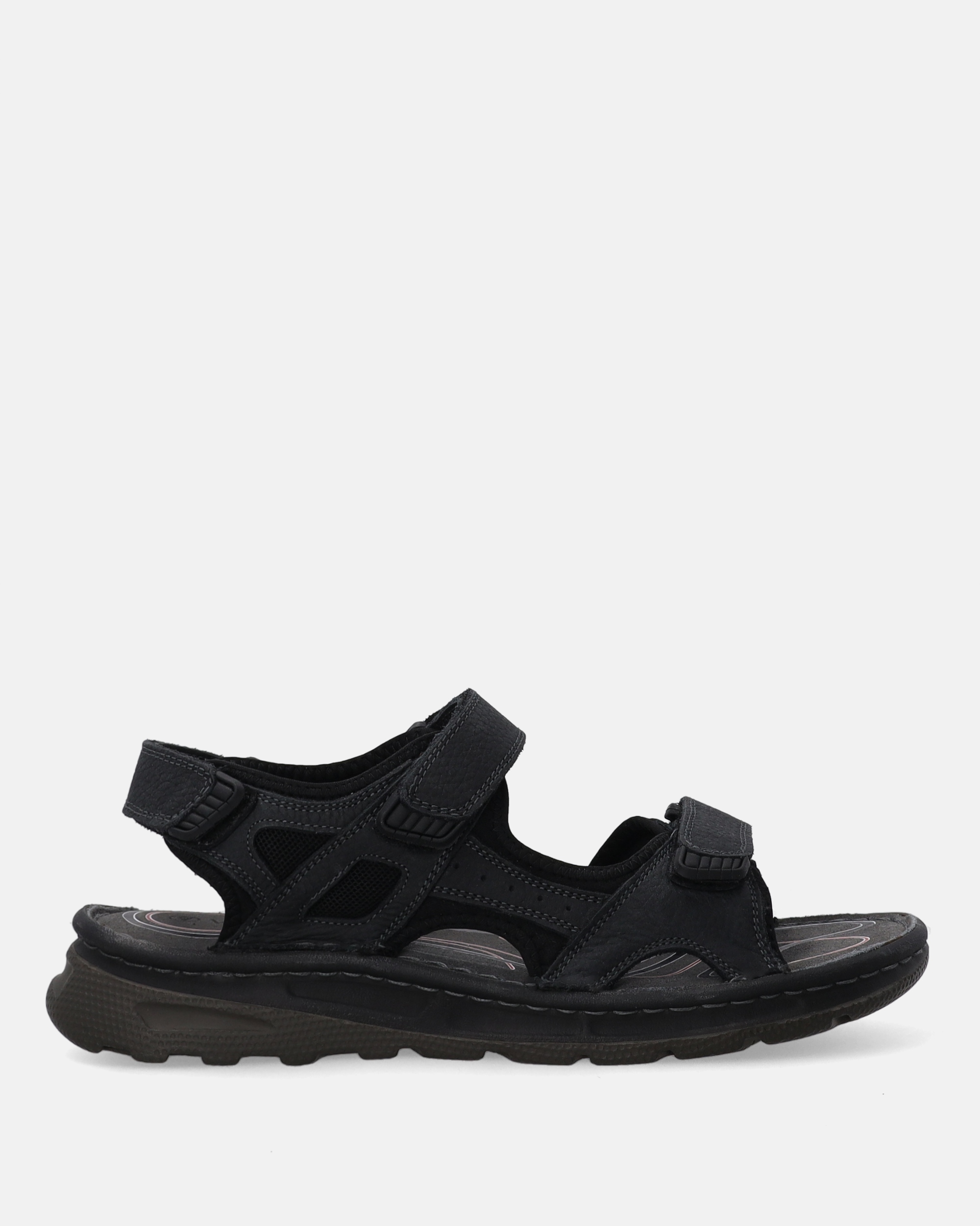 Сандалі з чорношкірими чоловіками, виготовлені з натуральної шкіри, закріплені трьома регульованими липучками. Інтер'єр, набитий тканинним хутром, і м'яка замша вставка забезпечує комфорт при носінні. Всі встановлені на високій підошві з протектором і закругленими пальцями.