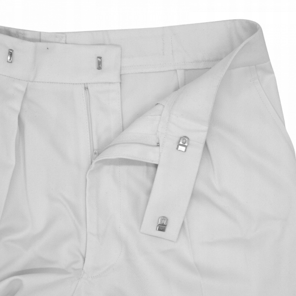 Оснащено регулюванням окружності талії. Застібається на блискавку і два гачки всередині пояса. Штани мають шлевки максимальною шириною 3,5 см.