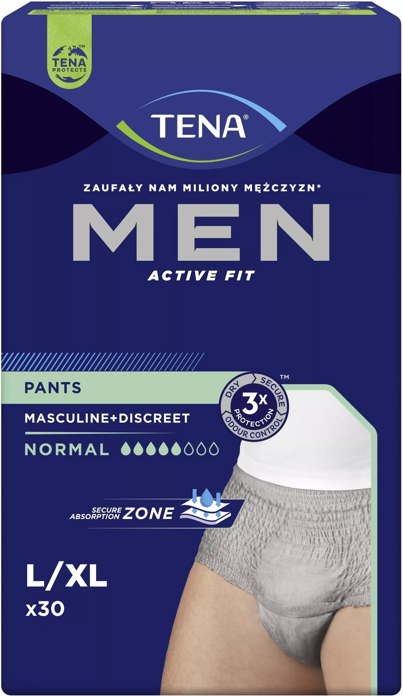 Ці чоловічі трусики від нетримання сечі непомітні та надійно сидять. Сірі чоловічі штани TENA Normal Grey схожі на звичайні трусики, з чоловічим кроєм, еластична гума, як дихаюча бавовна. Вам не потрібно боятися відвідування кінотеатру, спортзалу чи роботи, оскільки ці трусики допоможуть вам контролювати ситуацію.