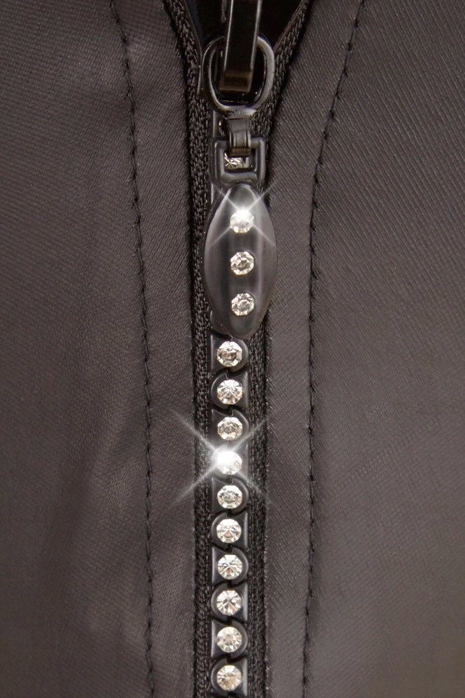 Технічні параметри: Матеріал: 90% поліестер, 10% спандекс, покриття: поліуретан Розмір: M Колір: глянцевий чорний Блискавка: прикрашена кристалами, спереду