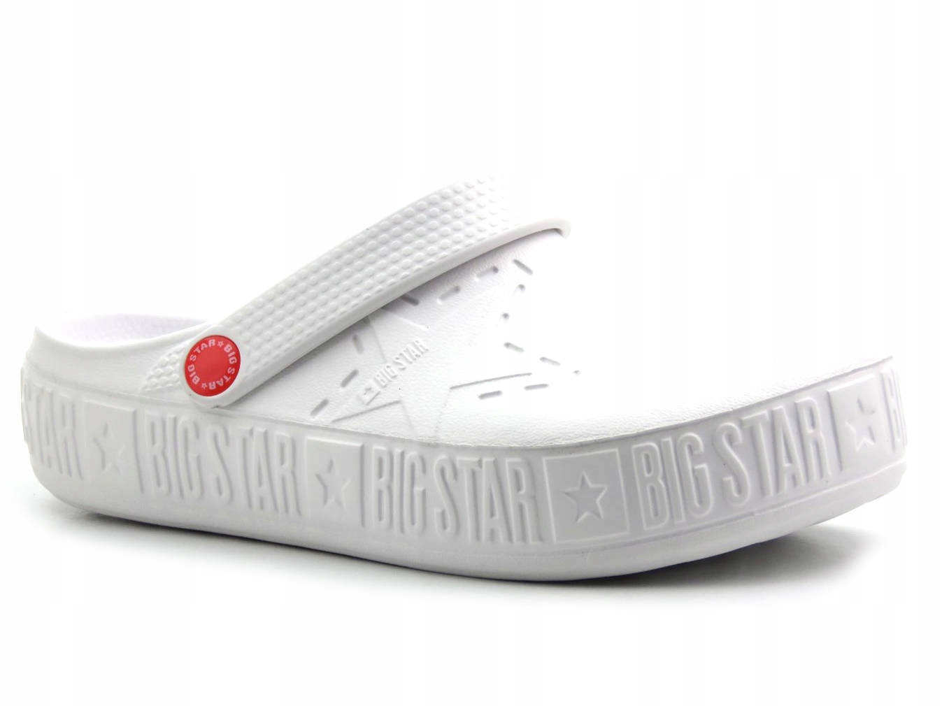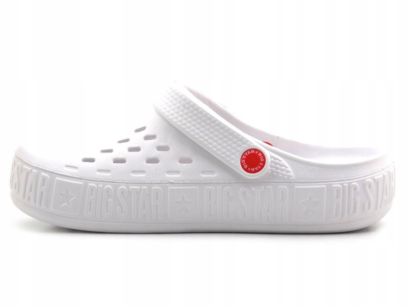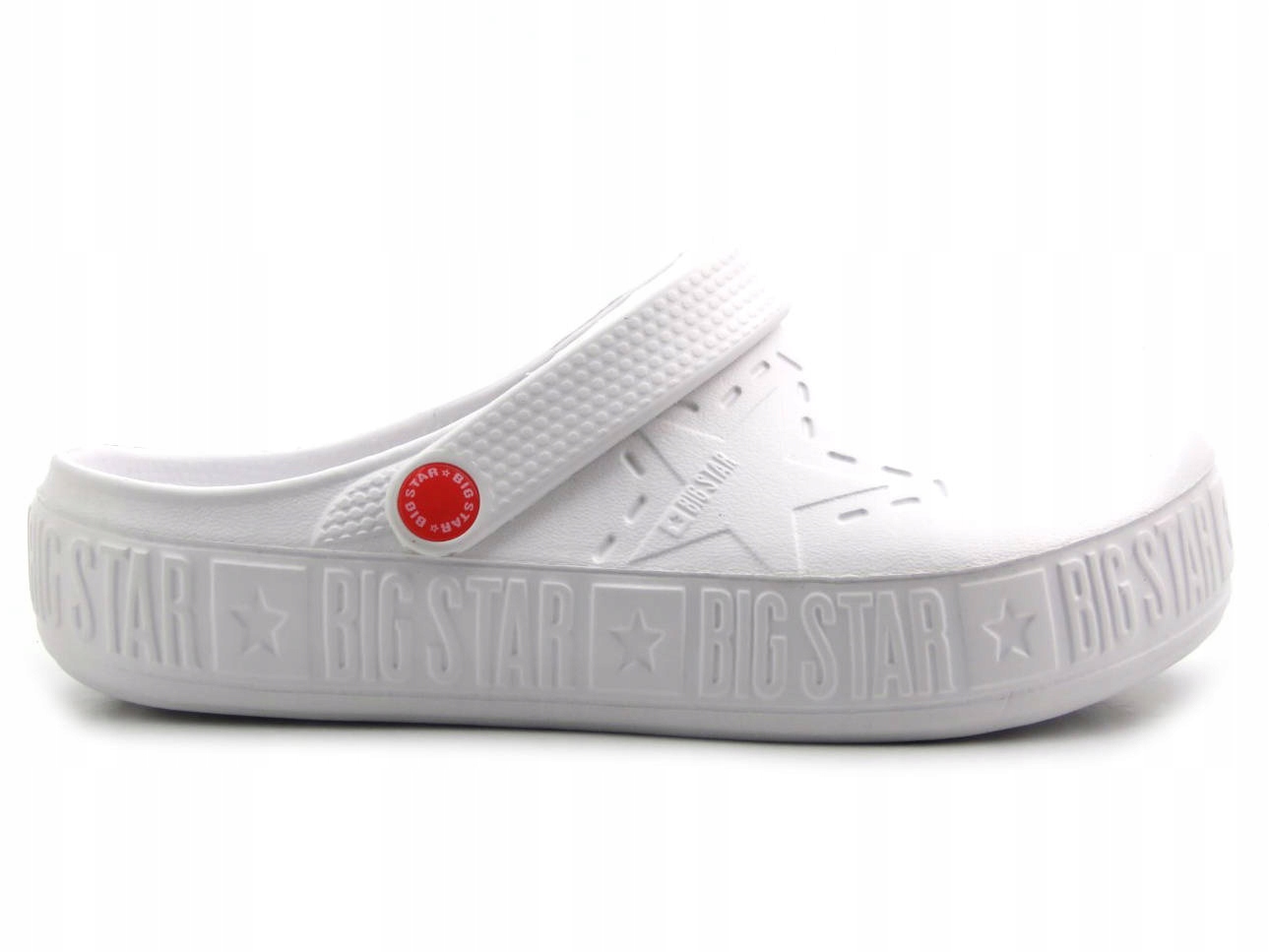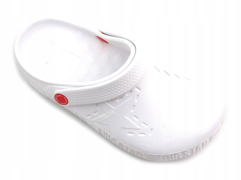 Шльопанці від відомого бренду Big Star відрізняються зручністю та модним зовнішнім виглядом. Вони виготовлені з легкого білого поролону. Мають мобільний ремінець, який можна розмістити за п'ятою, завдяки чому шльопанці не сповзають з ноги. Протиковзкі виступи мінімізують ковзання і м'яко масажують стопи, що робить модель ще більш зручною. Поролонові шльопанці водонепроникні, тож ідеально підходять для поїздок на пляж чи басейн. Отвори у верхній частині пропускають повітря, щоб нога могла дихати, а шльопанці швидше висихали. Товста підошва амортизує ногу від нерівних поверхонь, і при цьому дуже легка. Верх прикрашений зіркою - символом бренду Big Star. Білі шльопанці вдало впишуться в багато стилів.