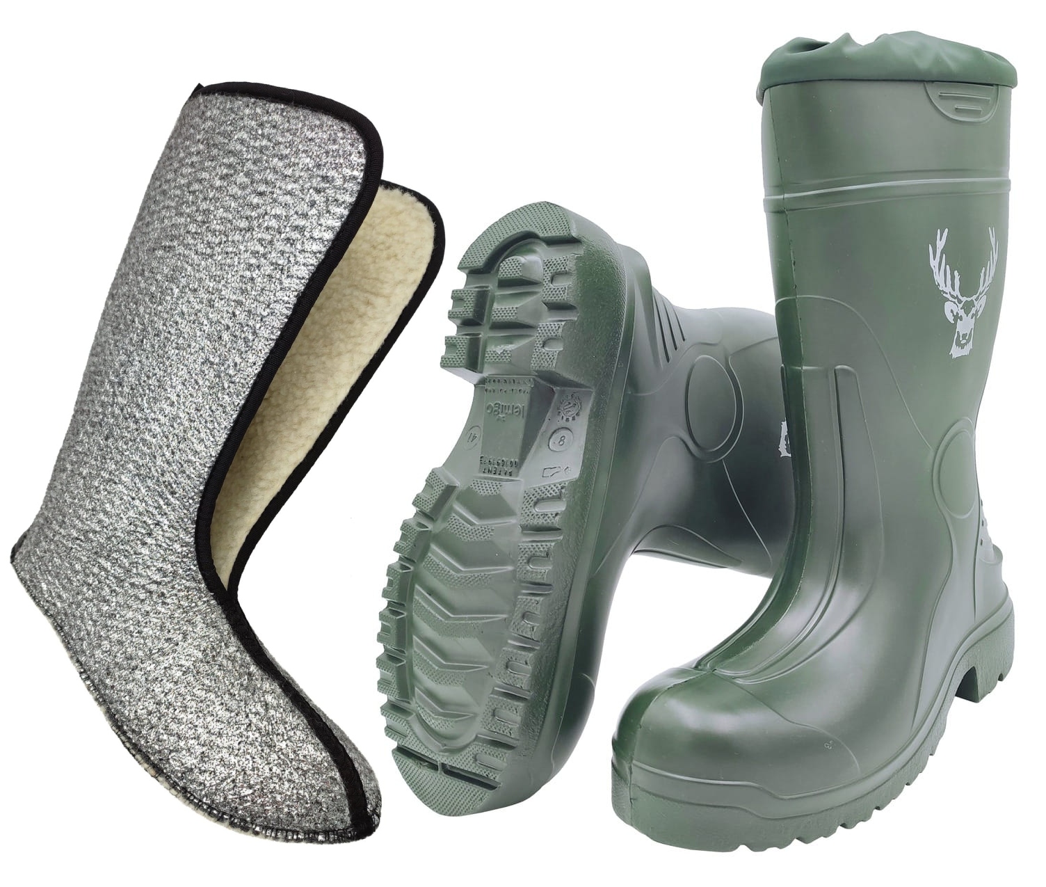 ✅ КОНСТРУКЦІЯ: суцільнопластикові бахіли, верхня частина покрита коміром із ПВХ, язичок ззаду, що полегшує зняття взуття, знімний нижній костюм з тришарового матеріалу (повсть + алюміній + овчина)
