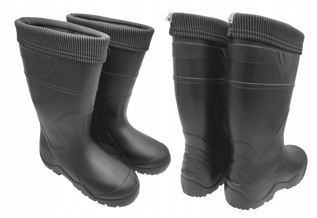 ЧОЛОВІЧІ УТЕПЛЕНІ ТУФІ NAPOLI MAX/ FAGUM STOMIL. Чоботи Wellington з піни Eva зі знімною утеплюючою вставкою. Призначений для людей, які працюють в умовах, де необхідний захист від вологи, бруду, снігу та холоду. Виготовлений з легкої піни EVA, яка є дуже міцною, гнучкою (навіть при низьких температурах), забезпечує комфорт і свободу рухів. Ізоляційна вставка в резинках підвищує тепловий комфорт, особливо в холодні умови. Чорний колір. Вага: близько 0,8 кг. Висота: 38 см. Розмір: 39 - 47. Матеріал: Веллінгтон - піна EVA/утеплювач - повсть. Конструкція: Веллінгтон, зроблений методом ін'єкцій, характерна лінія, добре виліплений протектор, змінна ізоляційна вставка. Застосування: робота на відкритому повітрі - рибна промисловість, очисні споруди та гідротехнічні споруди, садівництво, сільське господарство, будівництво, відпочинок - риболовля, полювання, кемпінг, прогулянки в лісі.