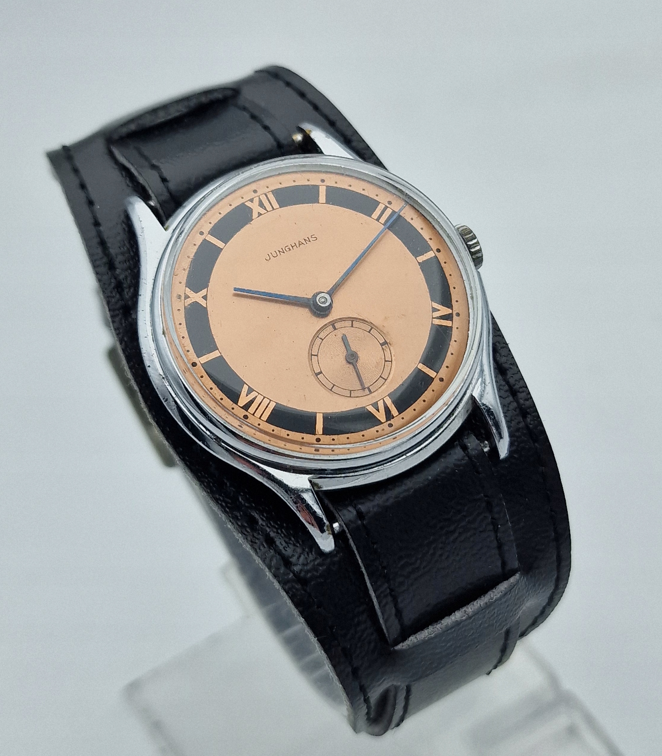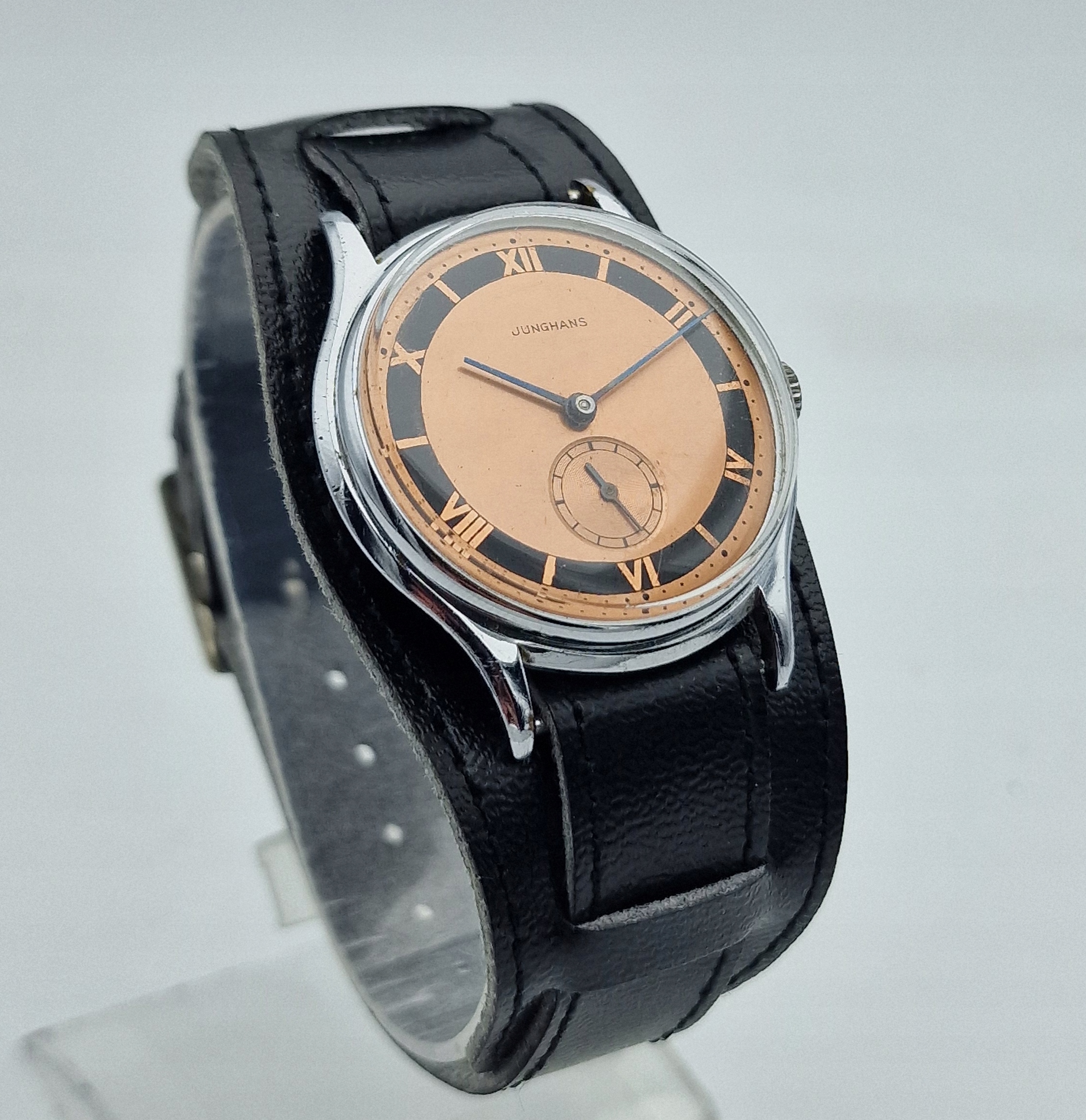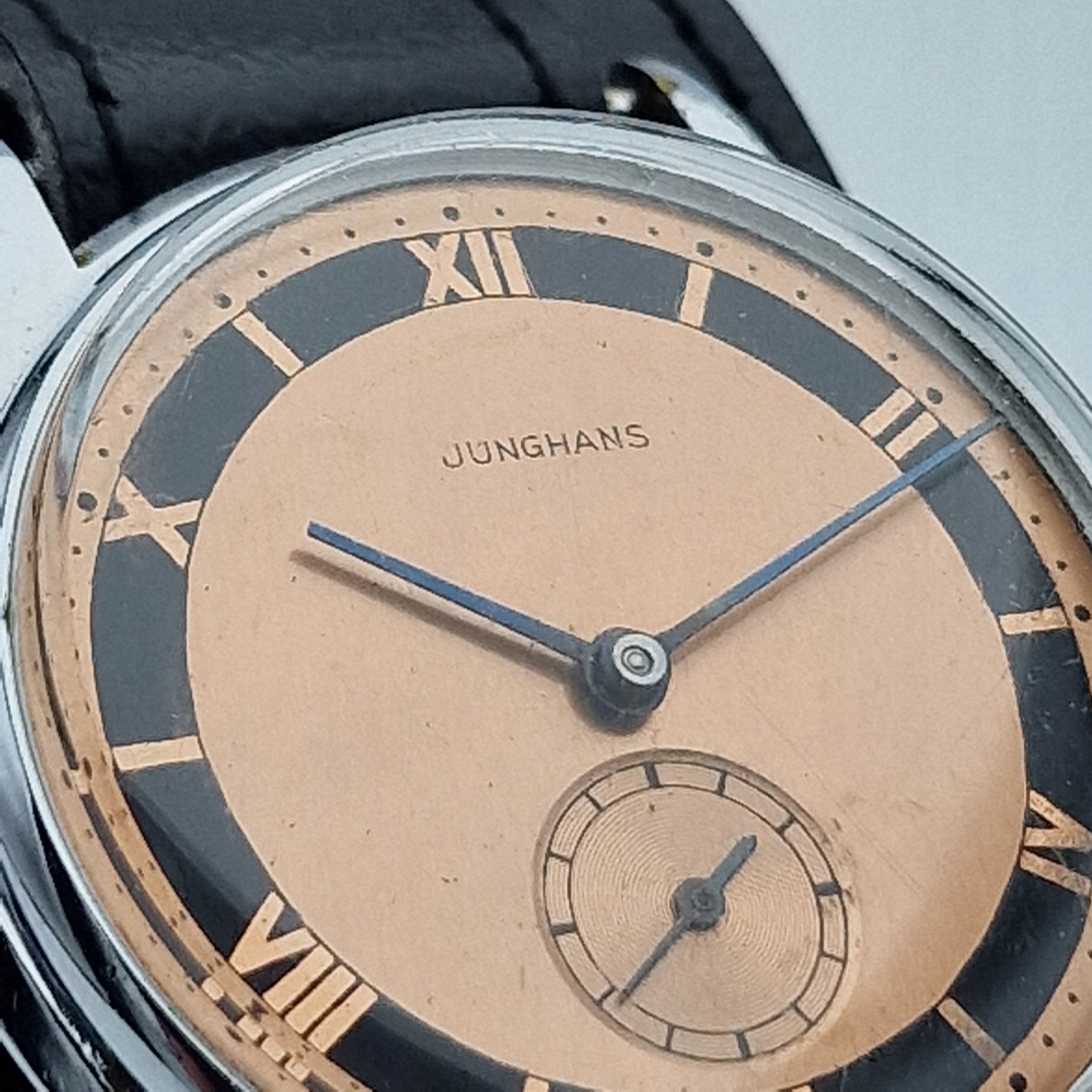 - золотий металевий диск з чорним кільцем та окрема секунда о шостій годині. Оригінальний щит, підписаний: " junghans ". Щит знаходиться в майже ідеальному стані, показаний на знімках.