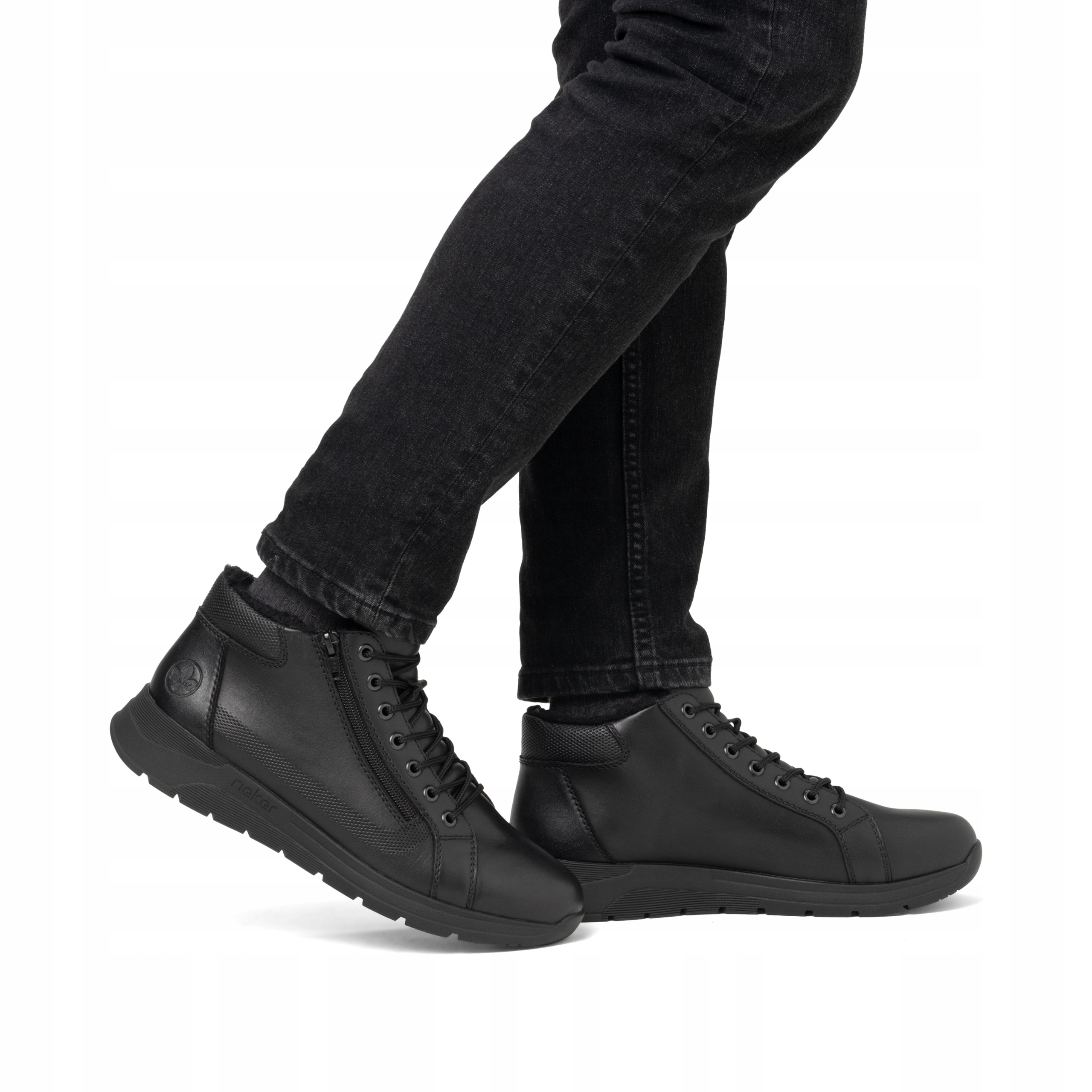 Взуття Rieker в трекінговому стилі з натуральної шкіри чорного кольору. Литі підошви, дуже легкі та гнучкі. Черевики на шнурівці на блискавці. Для догляду рекомендується масло для взуття нейтрального кольору. Продукт німецько-швейцарської компанії Rieker Antistress.