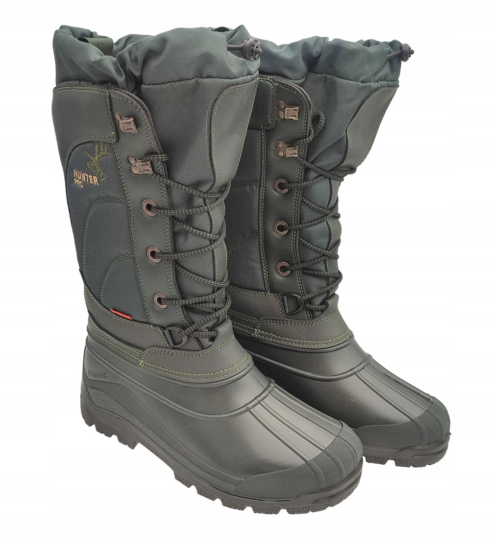 СНІГОВІ ЧОБОСІ HUNTER PRO/ DEMAR. Професійне взуття, призначене для складних зимових умов. Висока якість і безпроблемне використання. Взуття відповідає вимогам навіть найвибагливіших любителів зимових пригод, ідеально підходить для пересування по складній місцевості. Взуття еластичне і не змінює своїх властивостей при низьких температурах, стійке до вологи та промокання. Конструкція снігових черевиків забезпечує надійну теплоізоляцію, захист стопи в найекстремальніших умовах і найвищий комфорт використання. Колір: відтінки зеленого. Розмір: 40 - 47. Верх: матеріал, схожий на шкіру + міцна поліестерова тканина. Ізоляційна вставка: багатошарова, знімна, 100% вовна . Конструкція: високий верх, у верхній частині верху є комір з рантом, що запобігає потраплянню снігу в взуття, регулювання за допомогою шнурівки, змінна утеплююча вставка з вовняним хутром всередині, термокаучукова підошва, добре виліплений захисник. Підошва стійка до ковзання, що забезпечує стабільність, комфорт і безпеку в несприятливих умовах, таких як нерівні, слизькі поверхні в гірській і лісовій місцевості. Застосування: зима на природі, полювання, лісове господарство, рибалка.