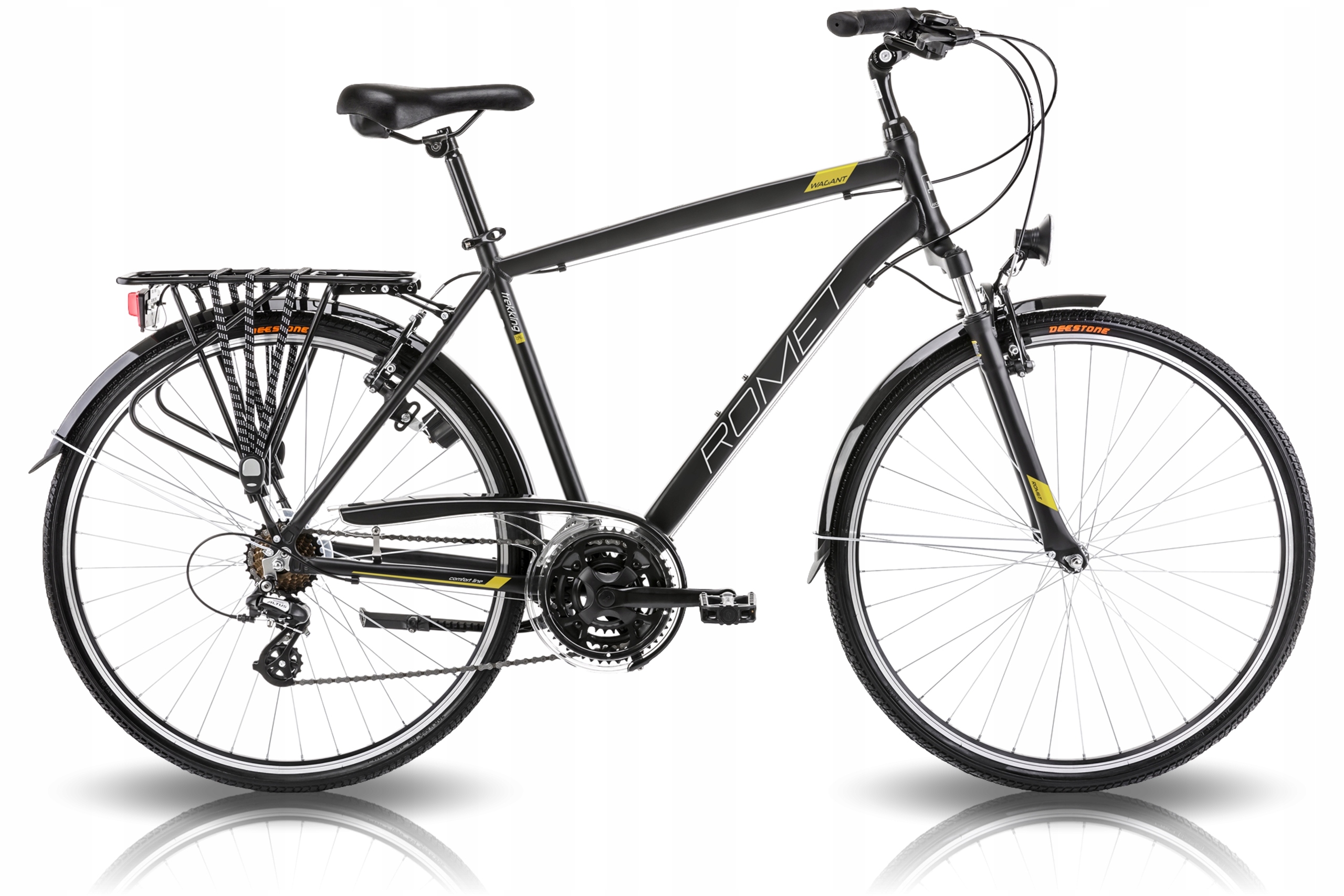 Багатозадачність підкреслюється додатковим обладнанням. Кожна трекінгова модель ROMET на заводі оснащена: стійками, бризковиками, потужним переднім/заднім освітленням, стійкою опорою та чохлом для ланцюга. Завдяки цьому ваш велосипед може супроводжувати вас під час поїздки на вихідні, а також довезти вас на роботу.