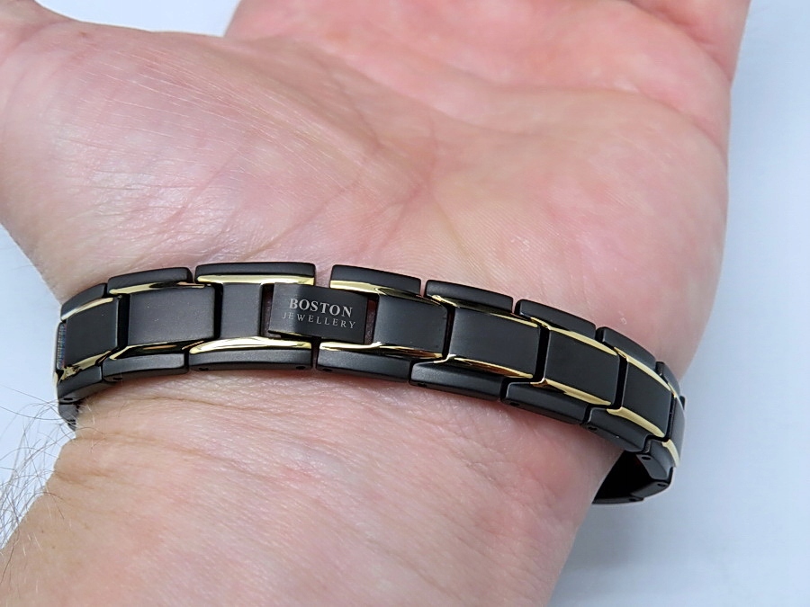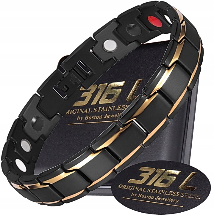 У цій пропозиції ми представляємо виключно елегантну чоловічу модель магнітного браслета, який виготовлений з ХІРУРГІЧНА СТАЛЬ 316L НАЙВИЩОЇ ЯКОСТІ, чорна анодована та покрита 18-каратним золотом. Ця модель відрізняється дуже елегантним поєднанням золотих і срібних елементів. Така композиція дуже ефектно виглядає на руці і справляє неймовірне враження!!! Це одна з найцікавіших і найбільш продаваних моделей за останній час!
