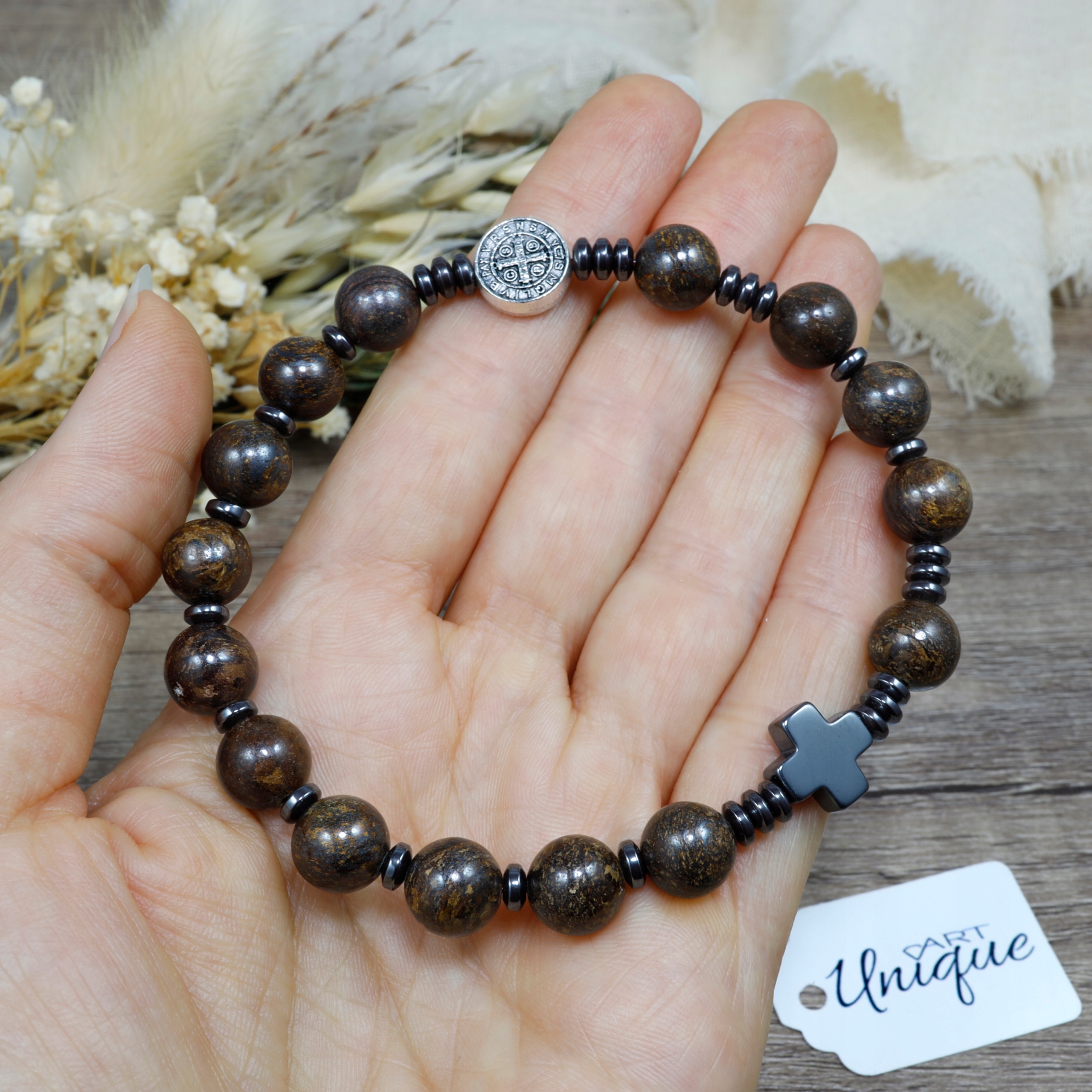 браслет, виготовлений з декоративних каменів - бронза і гематит з медальйоном св. Benedykta на сильній, подвійній силіконової еластичній. Презентації продукти у вигляді відео для перегляду ig та fb ➡ artuniquepl