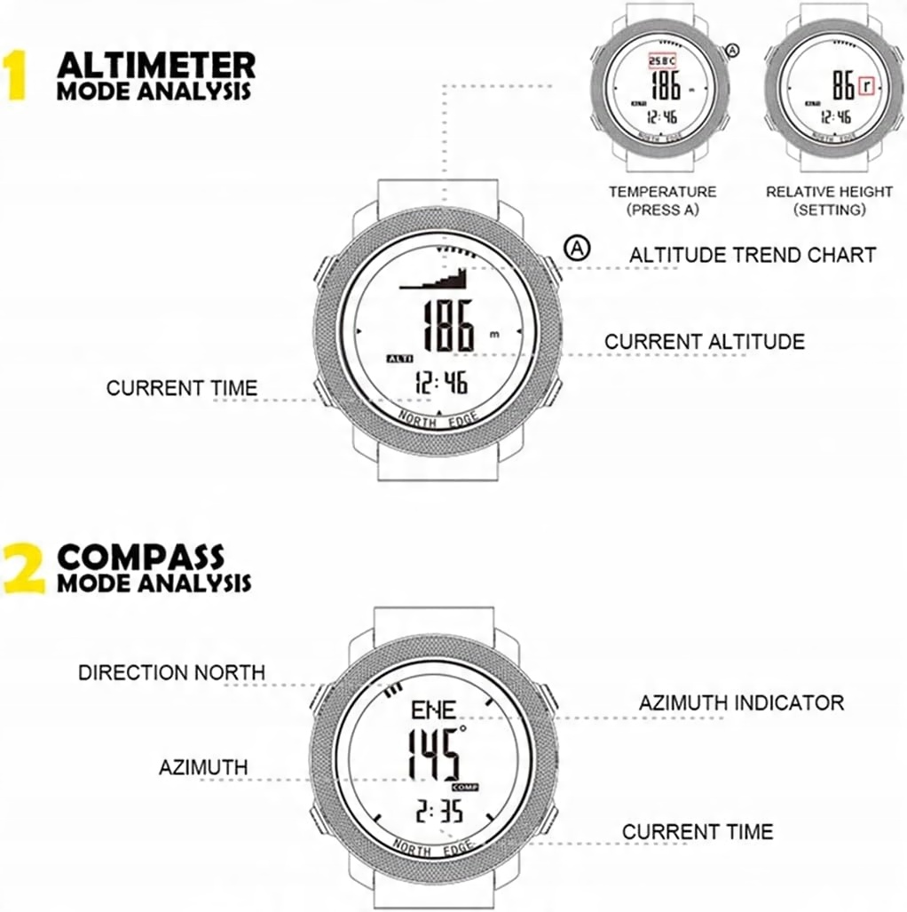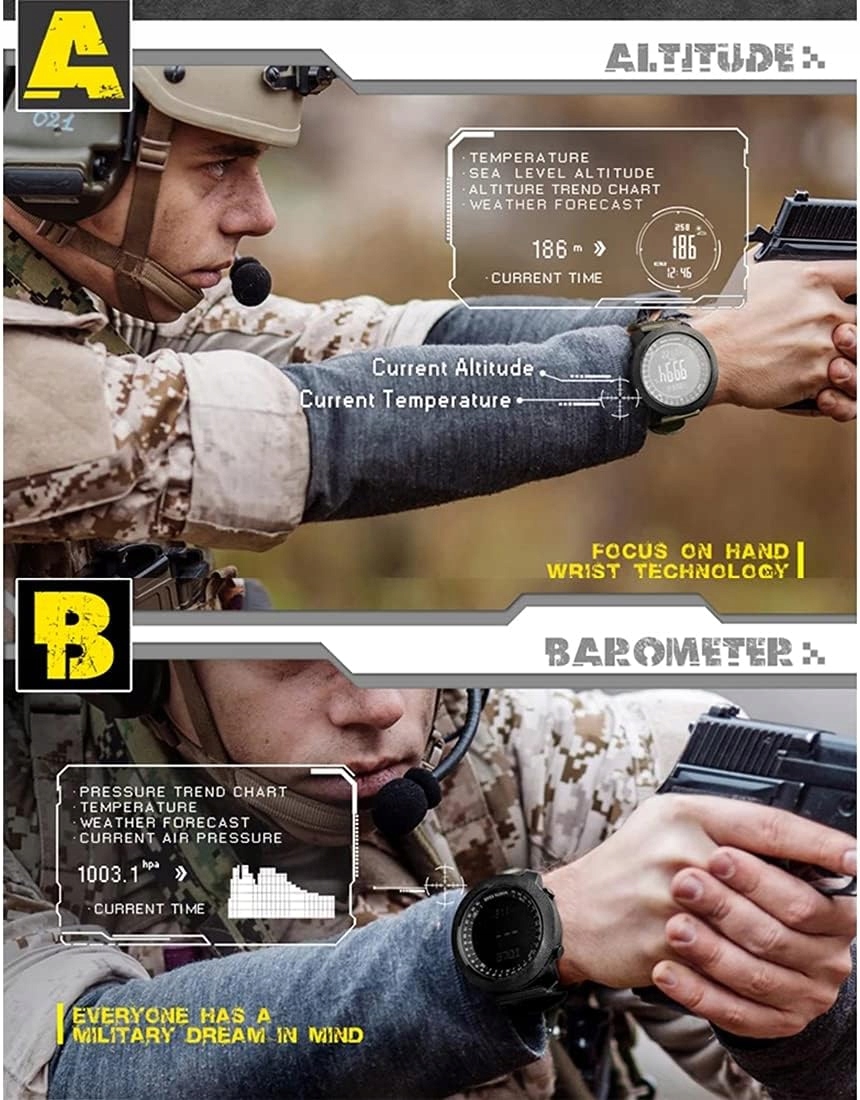 Основна функція Функція часу година хвилини другий рік місяць день тиждень 12 год. 24 год. Функція нагадування будильника 2 групи Функція нагадування будильника Функція погодинного нагадування Функція зворотного відліку 99 59 59 0 Функція секундоміра 0 99 59 59 99 може записувати 11 наборів даних одночасно Функція світового часу Автоматичне визначення літнього часу Функція нагадування про перемикання звуку клавіш EL Функція підсвічування. Водонепроникний спортивний годинник Sports Pedometer 3D pedometer точно фіксує ... Кроки вправ ходьби. Калорії точно записують споживання фізичних вправ. Зворотний відлік Краще володіння ритмом руху. Час тренування, пробіг тощо. Водонепроникність до 50 метрів, не турбуйтеся про підводні виклики та розважайтеся. Примітка: годинник не можна використовувати в сауні чи джакузі. Вимірювання барометричного тиску 300 1100 мбар 8859 32,484Inhg вимірювання висоти 698 9164M 2246 30067F Вимірювання температури 10 60 C 14 140 t Будильник компаса 2 будильники та погодинний час. Функція хронографа 99 годин 59 хвилин 5999 секунд 100 груп по колу Зворотний відлік 99 годин 59 хвилин 5999 секунд. Режим часу Максимальний діапазон часу становить 99 годин 59 хвилин і 5999 секунд. У цьому режимі натисніть D, щоб почати або зупинити. Після зупинки натисніть і утримуйте клавішу C протягом 2 секунд, щоб скинути налаштування. Сегментований запис часу Після початку відліку часу натисніть C, щоб вибрати коло, через 15 секунд відобразиться час, потім натисніть C, щоб вибрати наступне коло, натисніть D, щоб зупинити, натисніть b протягом 2 секунд, щоб увійти в інші функції. Вічний календар. Секундомір Світлодіодний дисплей Автоматична дата Вимірювання артеріального тиску Дисплей тижня Альтиметр Водонепроникний компас Хронограф Підсвічування Багаточасові зони Плавання Будильник Світлове реле