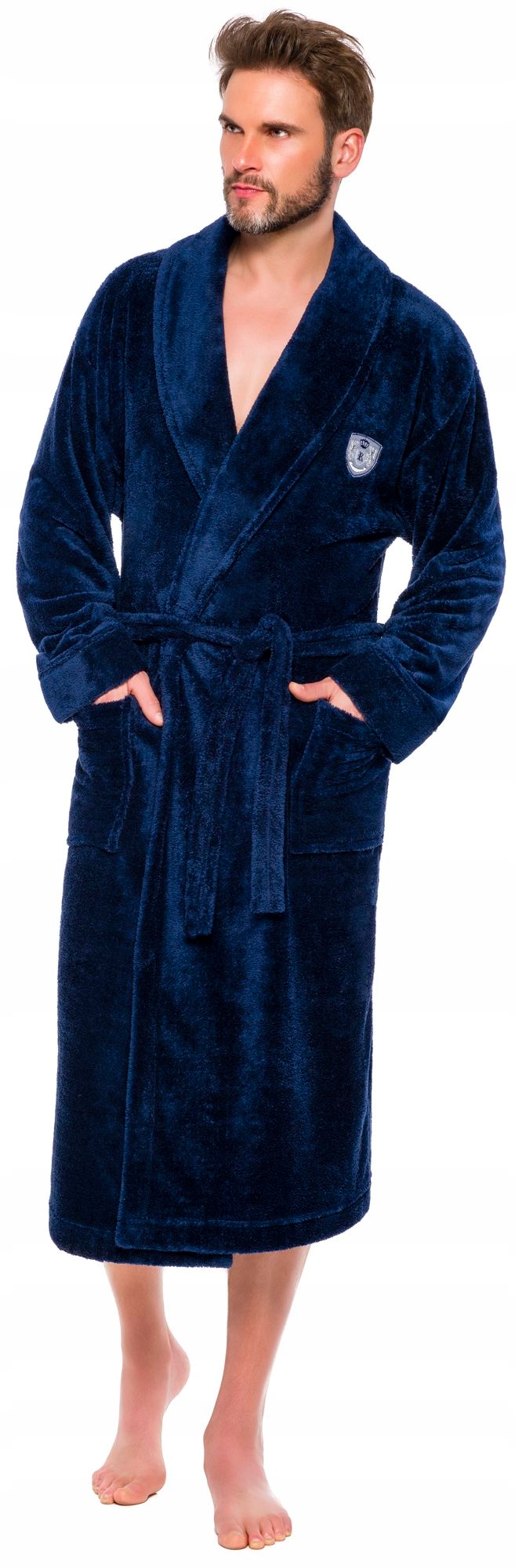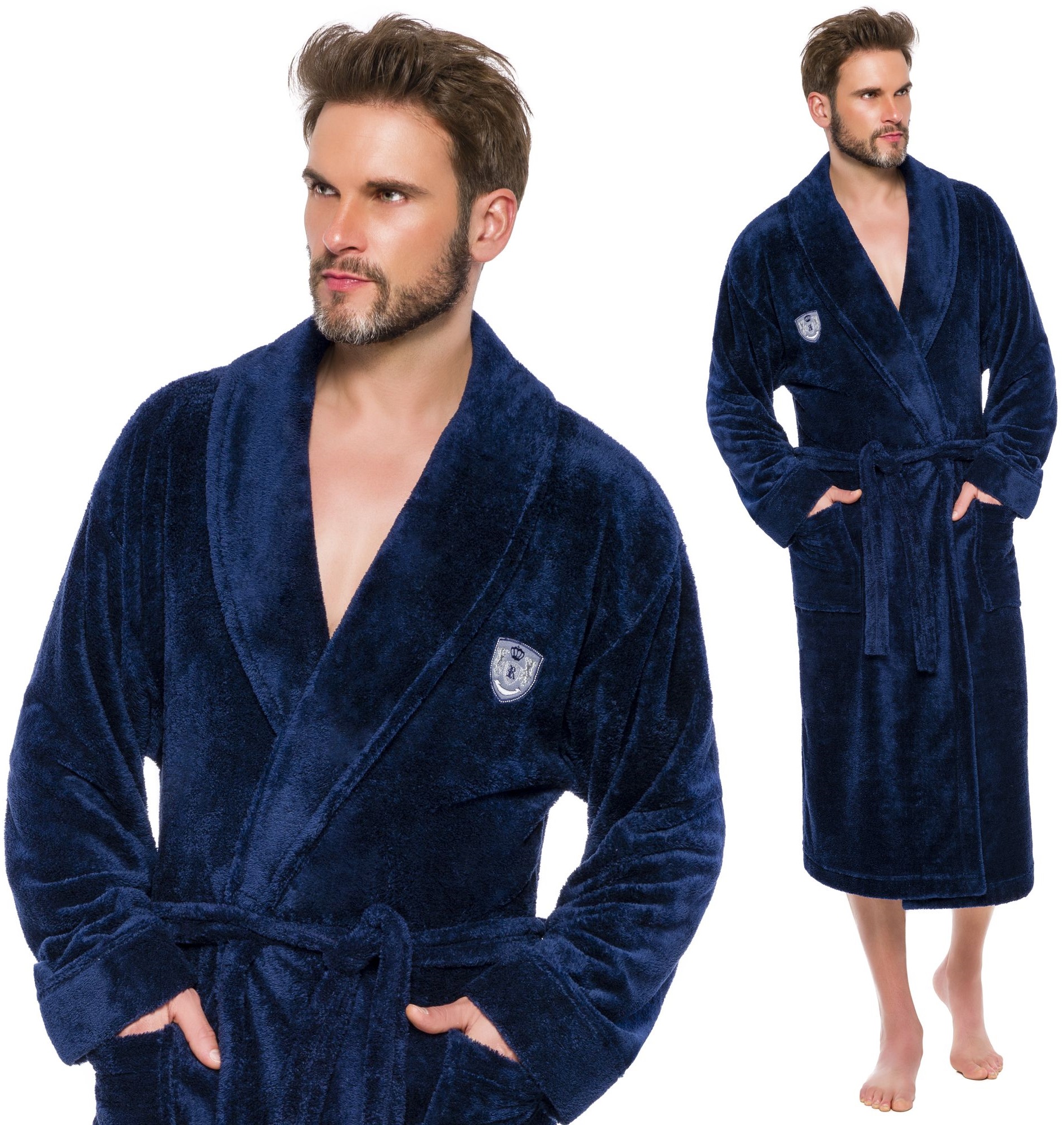 Чоловічий халат з коміром, що зав'язується на талії, з м'якої тканини, зовнішні кишені на стегнах, вшита аплікація на рівні грудей. Приємний і приємний на дотик, гарантує комфорт при носінні.