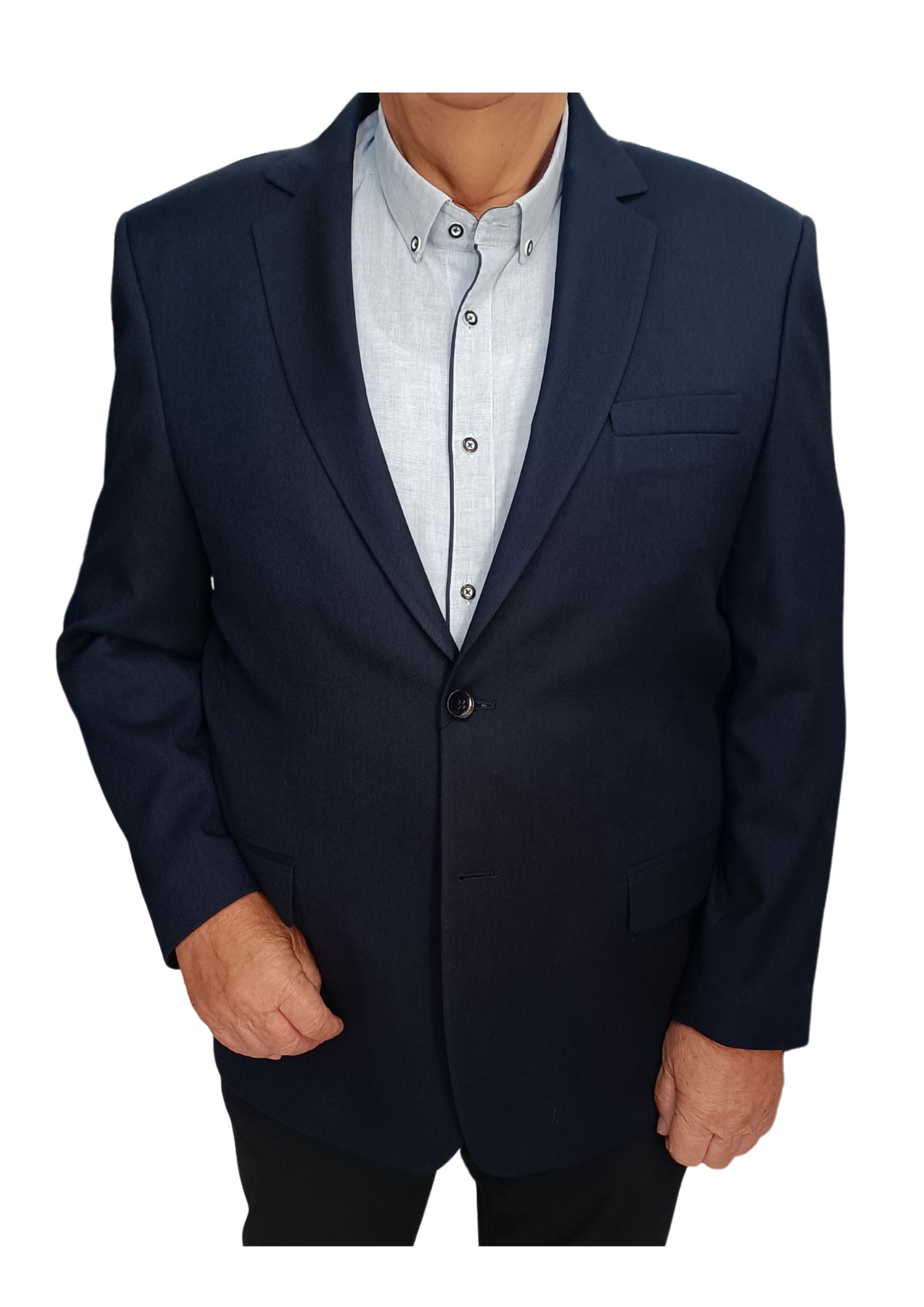 Темно-синій піджак класичного крою — незамінна пропозиція в чоловічому гардеробі. Куртка має 5 кишень - 2 бічні кишені з клапанами, 2 внутрішні кишені та одну нагрудну. Елегантний розріз ззаду. Все це оброблено підкладкою.