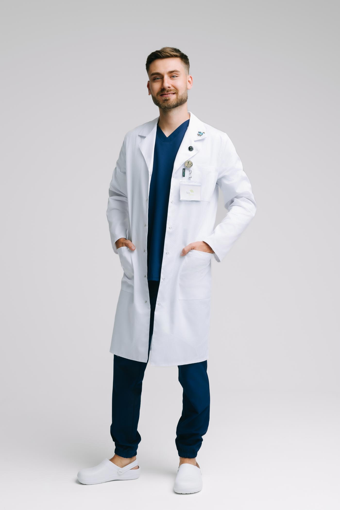 Класичний та сучасний вбрання, що використовується в університетах, лікарнях, клініках, лабораторіях, медичних установах. Кишені, з яких є практична ручка для ручки. На задній частині фартуха є невеликий ремінь регулювання, кріплений натисканням, який також має декоративну функцію.