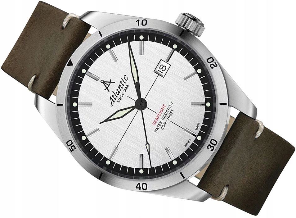 Чоловічий годинник Atlantic Seaflight 70351.41.21 оснащений швейцарським кварцовим механізмом Ronda R715. Срібний циферблат покритий сапфіровим склом, стійким до подряпин. Годинник оснащений дисплеєм дати, що показує поточний день місяця. Додатковою перевагою моделі 70351.41.21 є фосфоресцентний шар на стрілках і покажчиках, завдяки чому годинник м'яко підсвічується в темряві. Сталевий корпус тримається на шкіряному ремінці. Водонепроникність 5ATM захищає годинник від бризок.