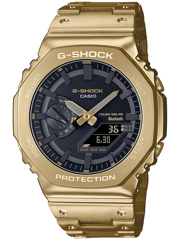 Цей годинник привертає увагу своїм кольором жовтого золота. Покриття в цьому кольорі показано не тільки на браслеті і корпусі, але і в деталях годинника - заводних головках, бічних кнопках і стрілках. Матове покриття верхньої поверхні корпусу в поєднанні з глянцевими елементами ідеально підкреслює благородний золотистий колір годинника. Все це надає годиннику GM-B2100GD надзвичайно розкішний вигляд.