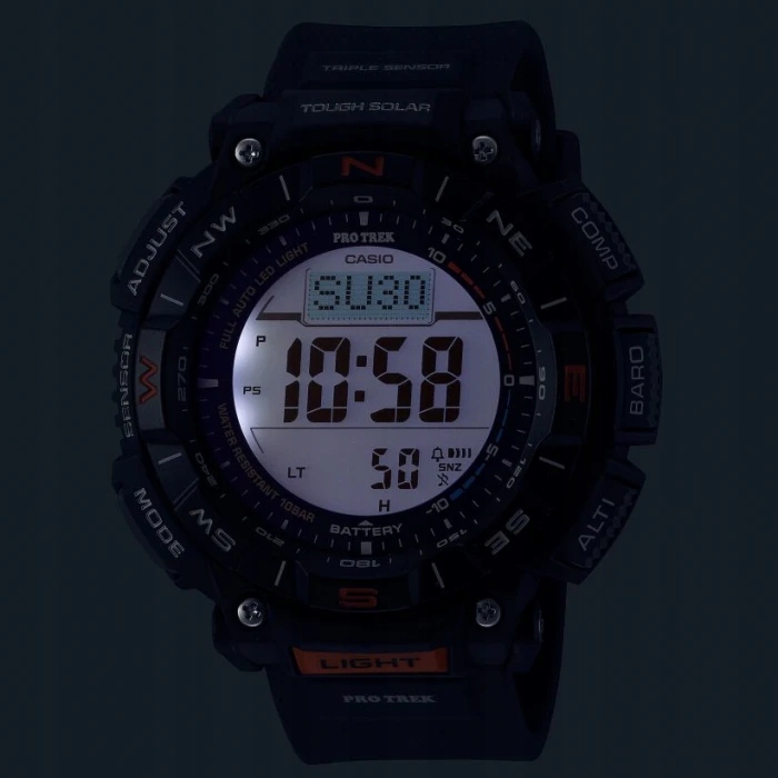 Чоловічий годинник Casio Pro Trek PRG-340-1ER — ідеальне рішення для сучасного та активного чоловіка, який очікує від годинника більшого, ніж просто точного показу часу. Ця модель є справжнім набором функцій, включаючи підсвічування: можливість вручну або автоматично підсвічувати цифровий дисплей і стрілки, стійкість до низьких температур (-10 ° C), підсвічування Neobrite, барометр (260/1100), термометр (-10). ° C / + 60 ° C), цифровий компас, висотомір до 10 000 м, пам'ять вимірювань висотоміра, світовий час, секундомір - 1/100 сек. - 24 год, таймер - 1/1 хв. - 1 година, 5 щоденних будильників, автоматична корекція руки, функції руху руки, кнопка блокування, технологія інтелектуального доступу, автоматичний календар і 12/24-годинний формат.