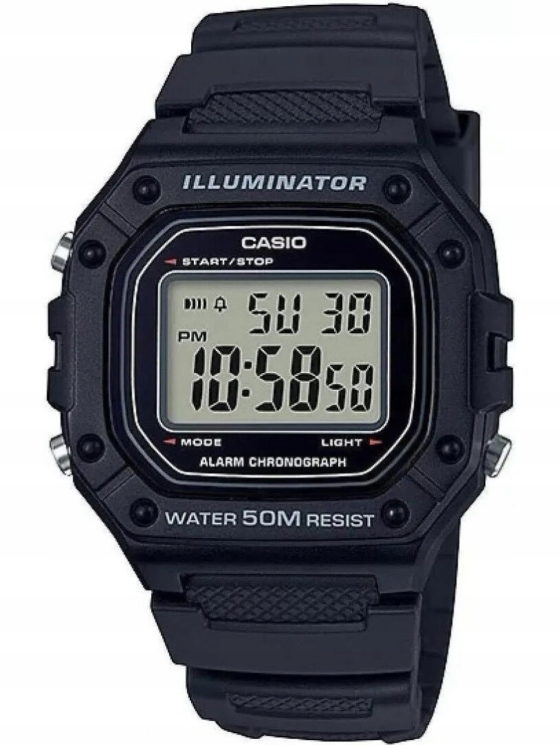 Чоловічий годинник Casio W-218H-1A — це вічна класика, яка ідеально підійде кожному чоловікові, поєднуючи в собі простоту, функціональність і спортивний дизайн. Ця модель є даниною культовим годинникам 1980-х років, які досі вражають своєю цікавою формою та надійністю. Його прямокутний чорний циферблат із чітким дисплеєм залишається читабельним за будь-яких умов, а тонкий дисплей дати додає практичності. Легкий корпус з міцного матеріалу в поєднанні з гнучким чорним ремінцем робить годинник не тільки стильним, але й надзвичайно зручним для повсякденного носіння.