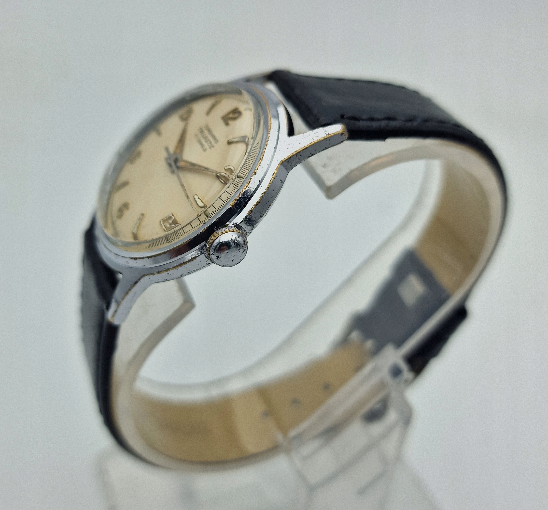 4 За механізмом підписи були порушені: " j, 93/1 ". Механізм на хорошій та точній ході після огляду та обслуговування у годиннику, у відмінному стані.- Chromed конверт. Задня кришка має підписи на ній: " сталева спина, ударна, водонепроникна, антимагнітна ". Оригінальне мереживо майже в ідеальному стані. Конверт у майже ідеальному стані, показаному на знімках.