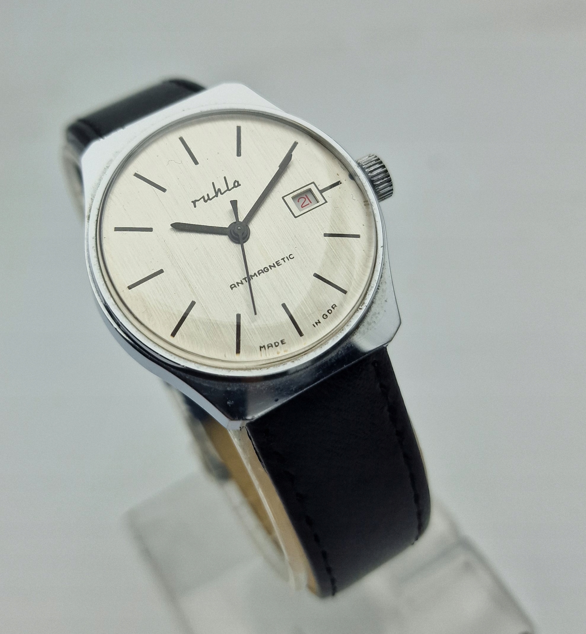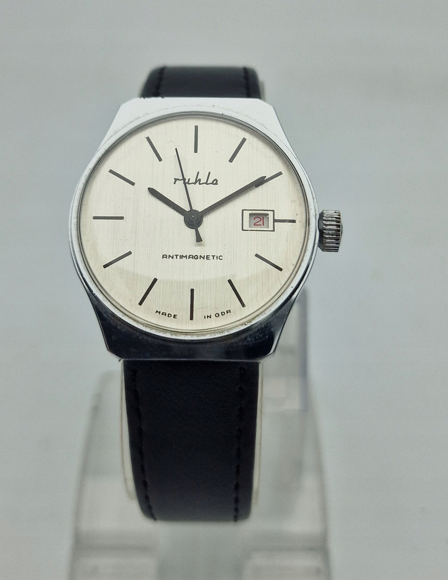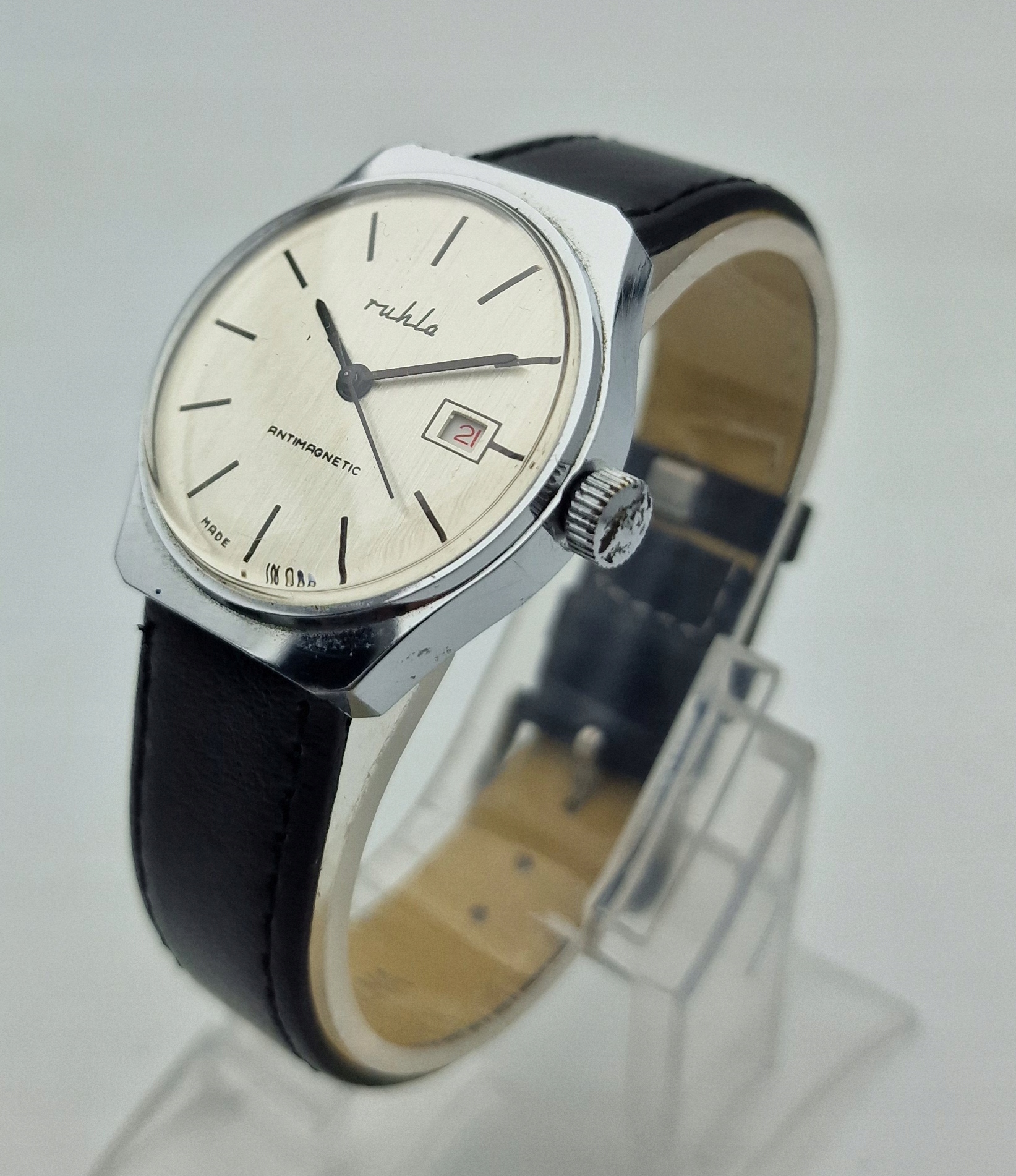 - срібний металевий диск із штампом побачення о третій годині. Підписаний щит: " ruhla антимагнітний ". Щит у ідеальному стані.