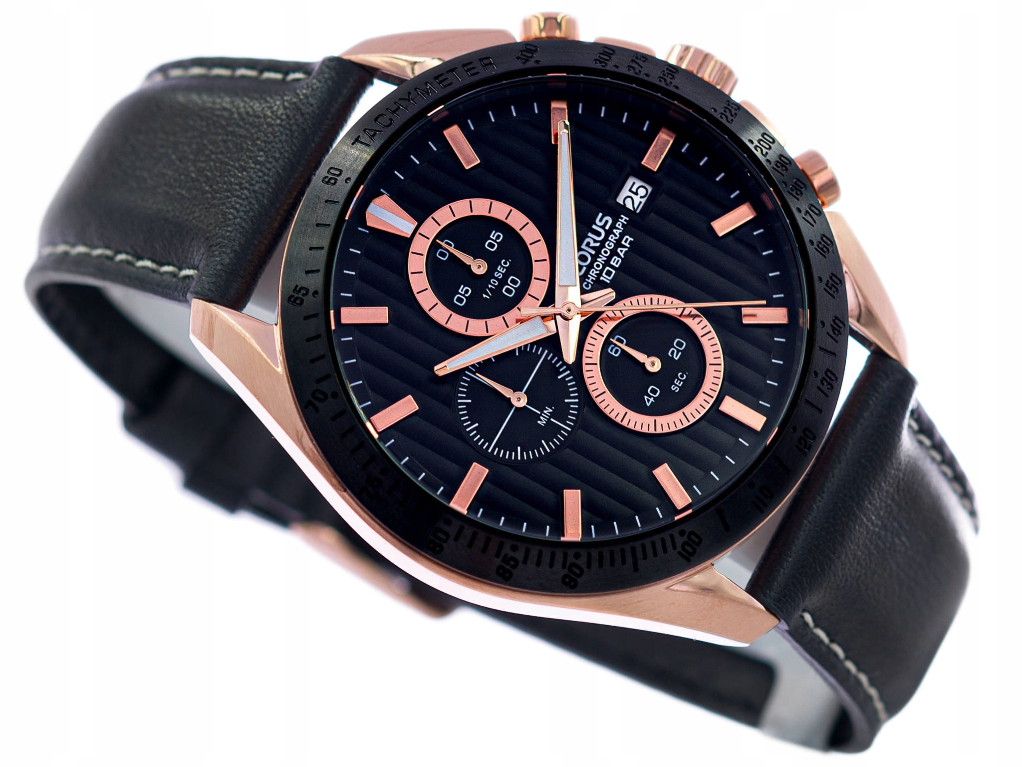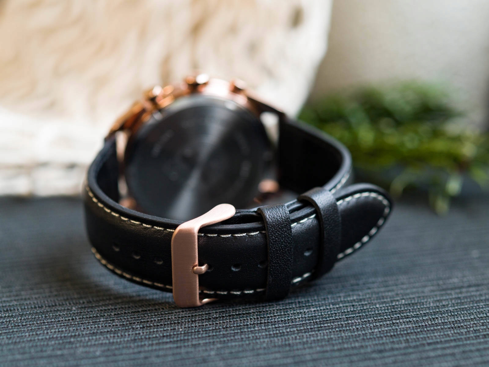 Сталевий корпусз рожевого золота з додаванням чорного в поєднанні з гладким і зручним шкіряним ремінцем чорного кольору.