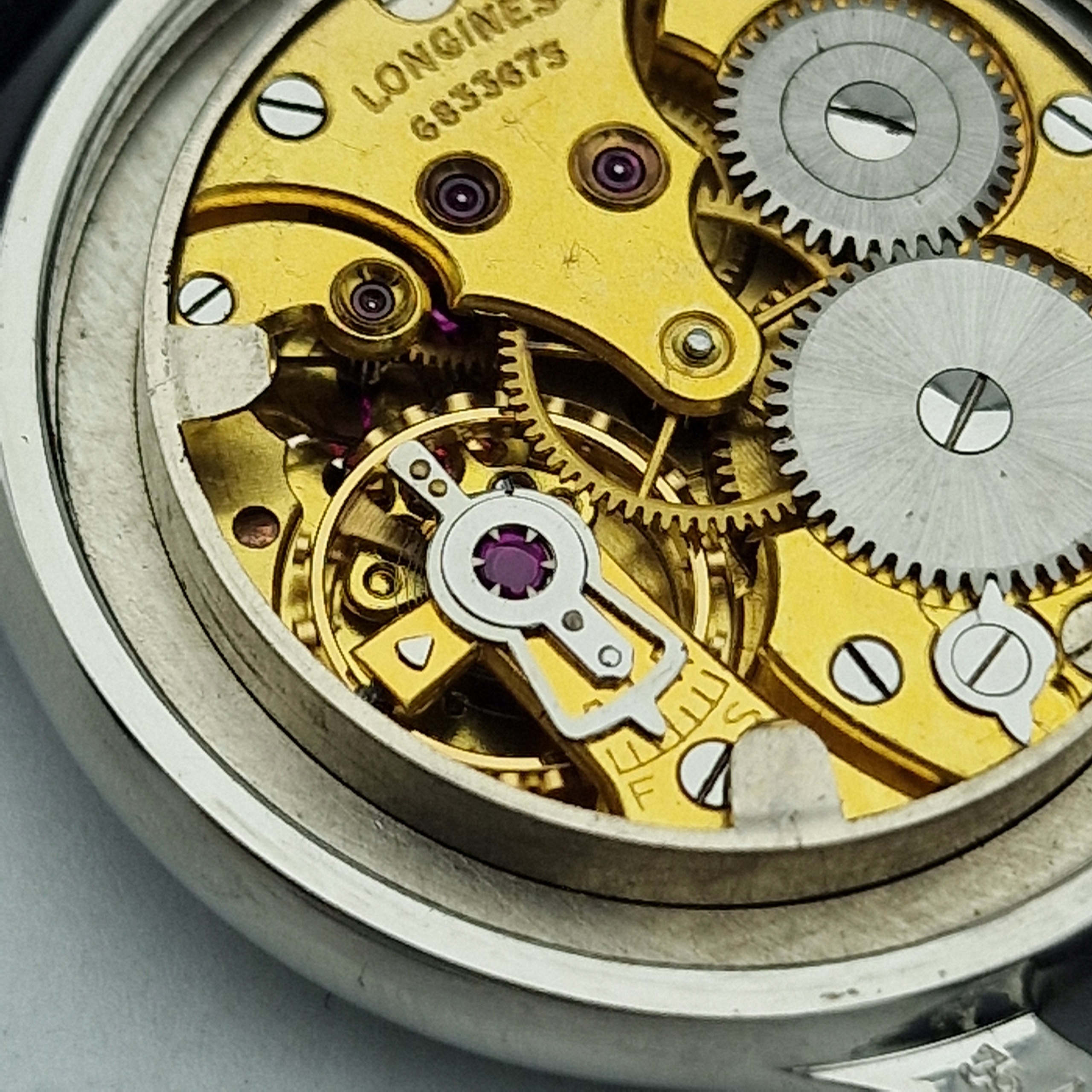 - Годинниковий механізм Calibre з 17 каменями, зі швейцарським анкерним спуском. Механізм має клеймо з такими підписами: «LONGINES 6833678». Механізм був перевірений і обслуговувався майстром годинників, працює добре і пунктуально, і знаходиться у відмінному стані.