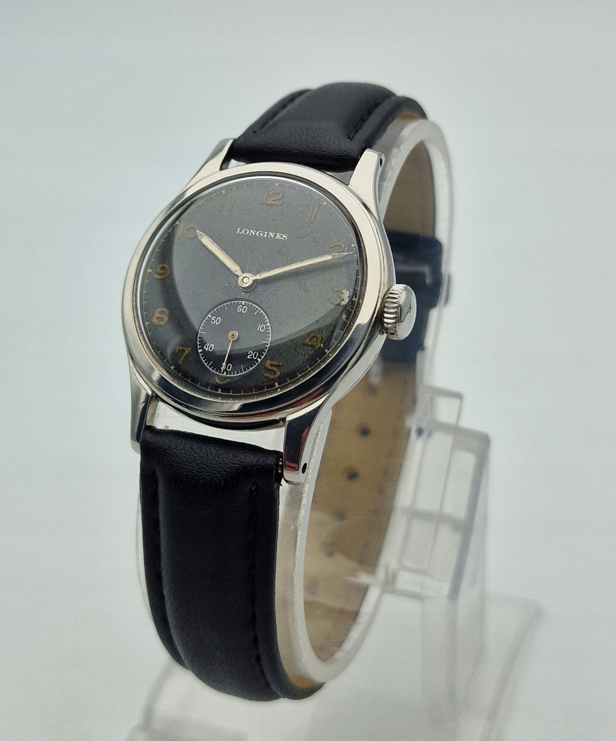 - Чорний металевий циферблат з окремою секундною стрілкою на шостій годині. Оригінальний циферблат із підписом: "LONGINES, SWISS MADE". Циферблат майже в ідеальному стані, видно на фото.