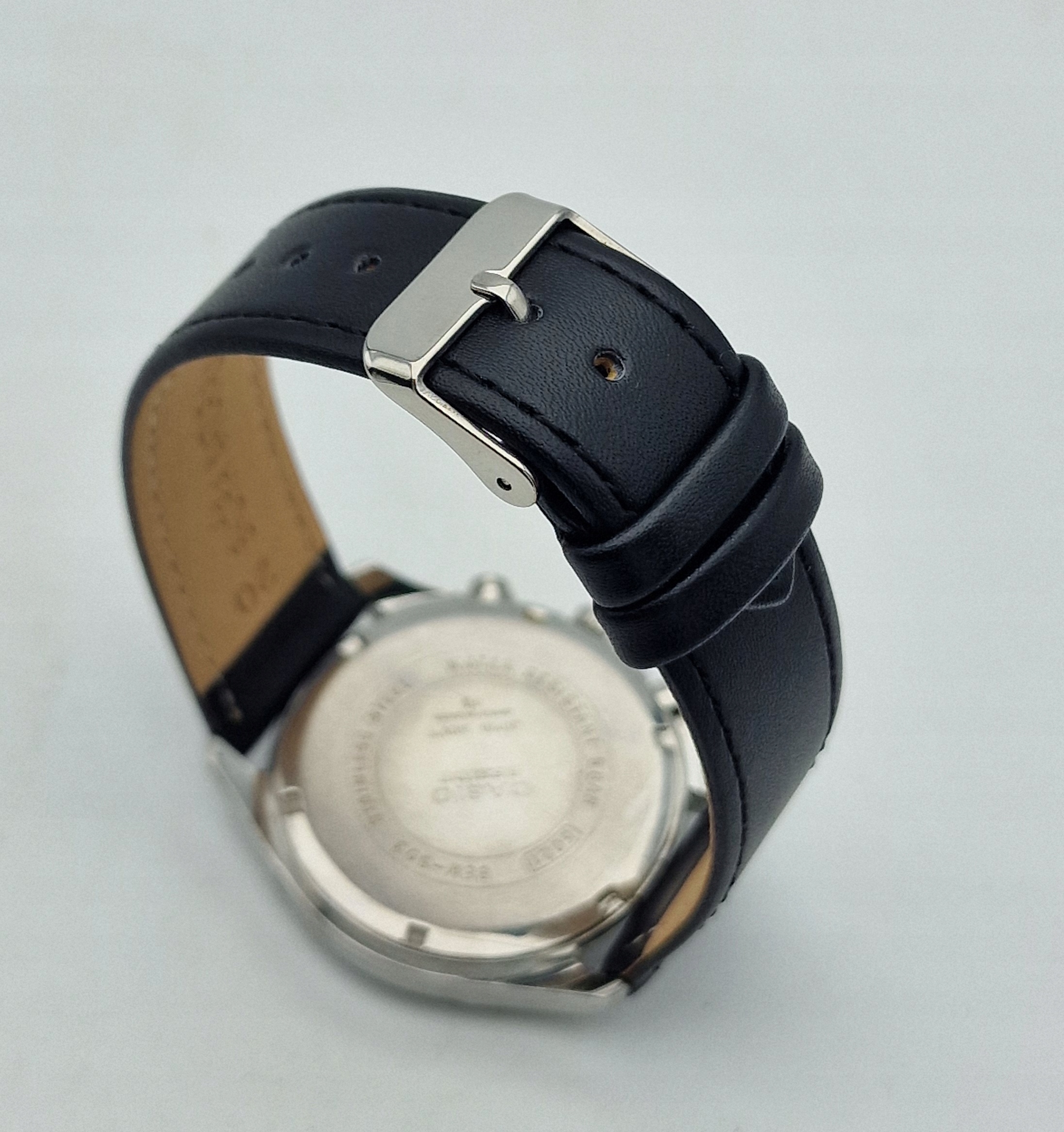 - Срібний циферблат зі срібними годинниковими мітками та секундоміром. Циферблат підписаний: «CASIO BESIDE CHRONOGRAPH, WATER RESIST 50M, JAPAN MOVT». Циферблат у ідеальному стані, як показано на фотографіях з аукціону.