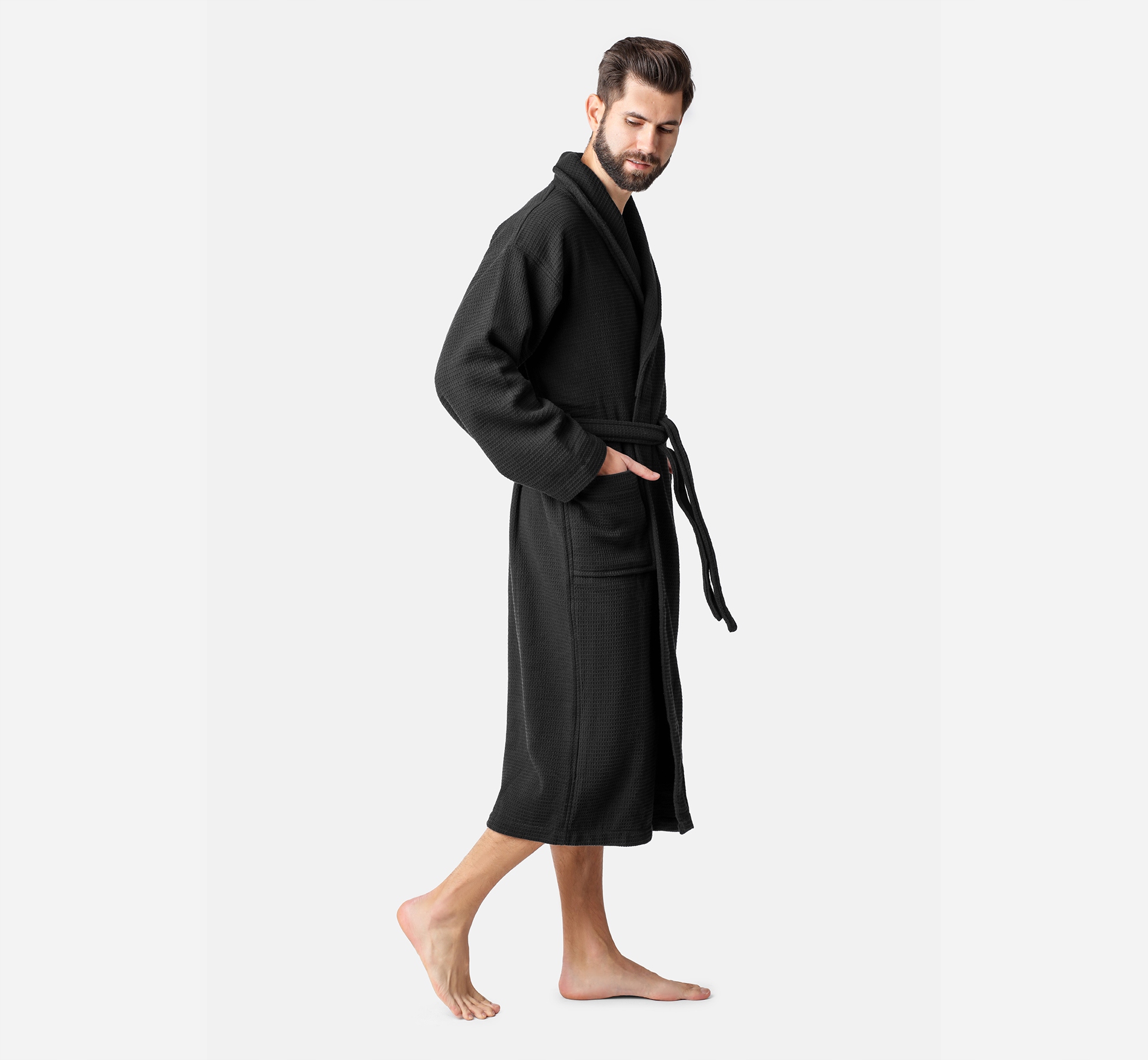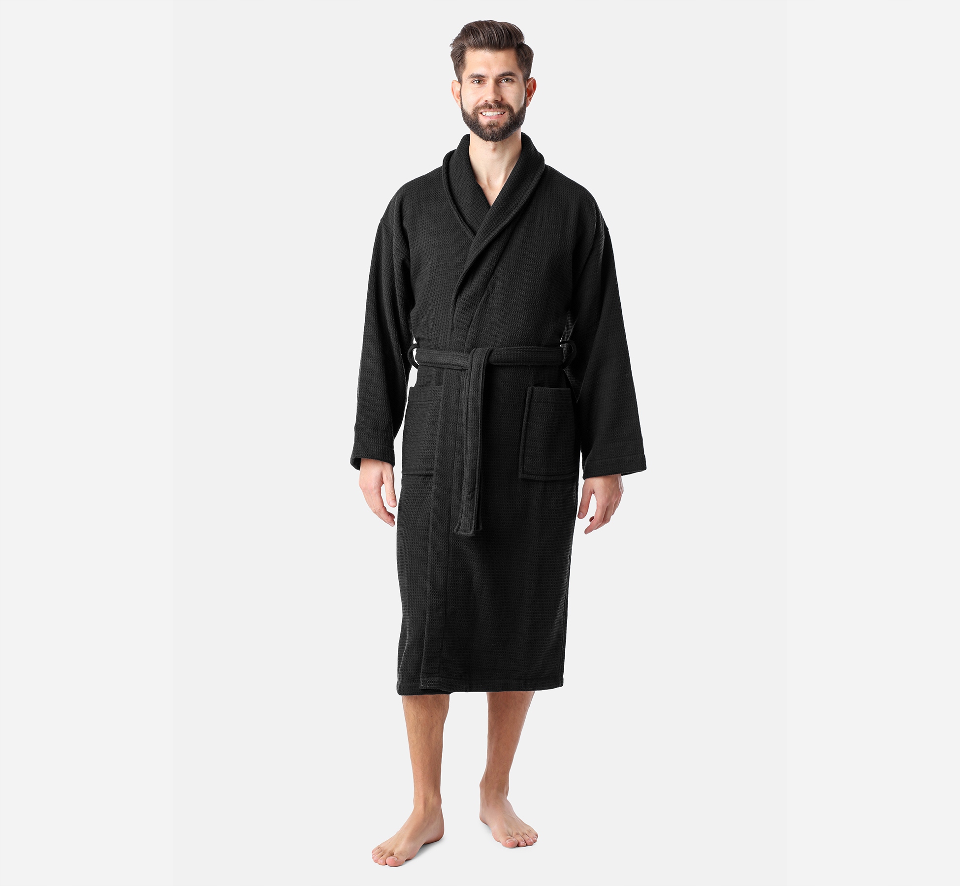 - Чоловічий халат; Вафельний екстер'єр, махрова підкладка всередині; Вага 425 г/м2; Має такі сертифікати якості: Oeko-Tex Standard 100, Oeko-Tex STeP