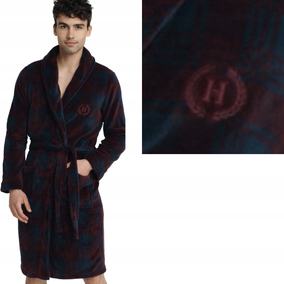 Елегантний чоловічий халат HENDERSON UNDEGRO бордового кольору виготовлений з м'якої флісової тканини, що забезпечує комфорт і добре зберігає тепло. На рівні грудей є вишивка з логотипом бренду. Це надзвичайно зручний халат вільного повсякденного крою довжиною до коліна. Він зав'язується на талії широким поясом, а спереду конверт, широкий комір і дві великі кишені для дрібниць роблять його практичним.