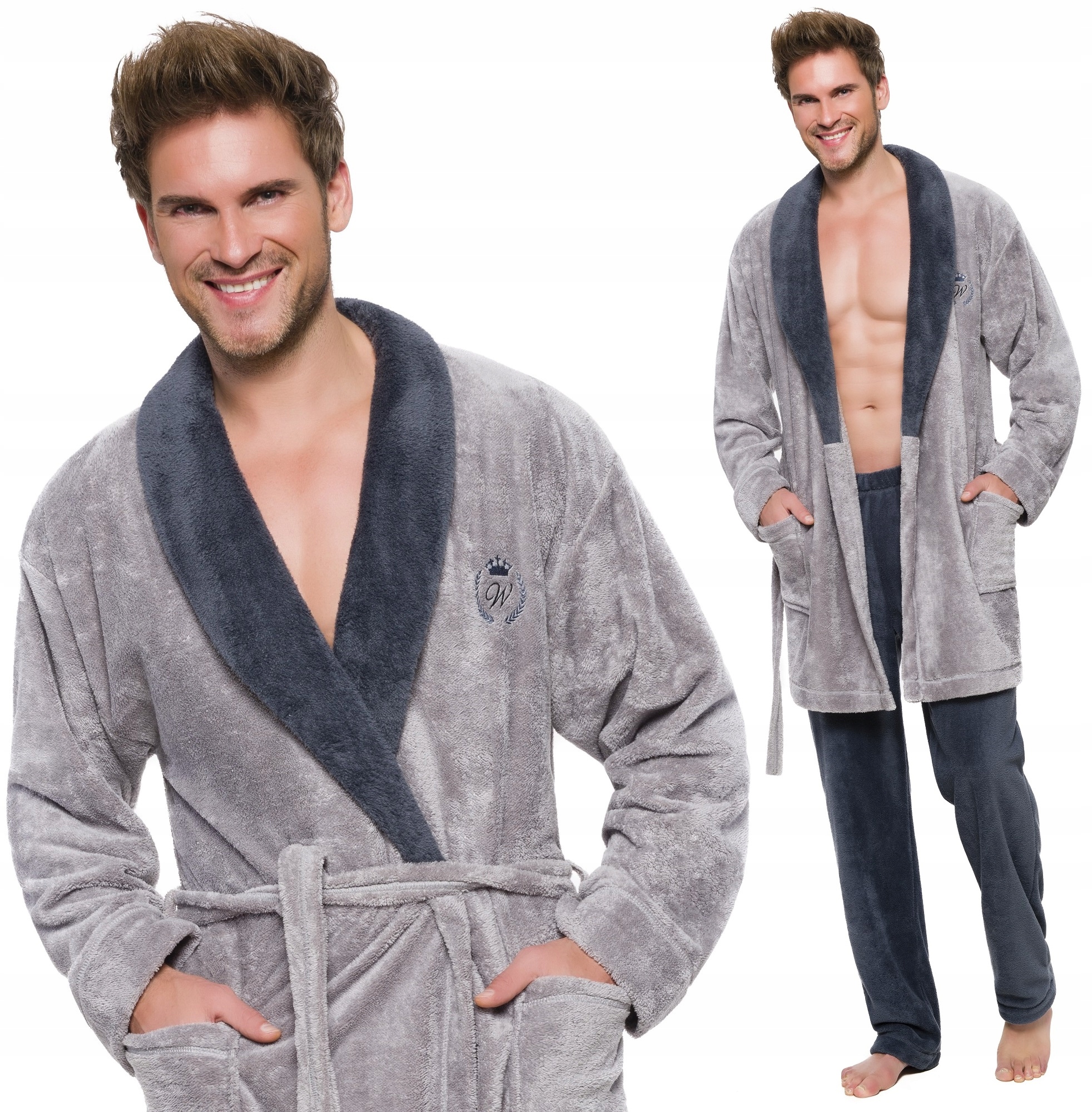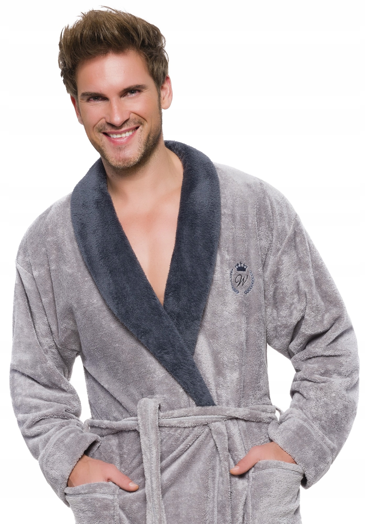 Чоловічий халат з коміром, зав'язується на талії, з м'якого Wellsoft, зовнішній кишені на стегнах, на висоті вишивка на грудях.